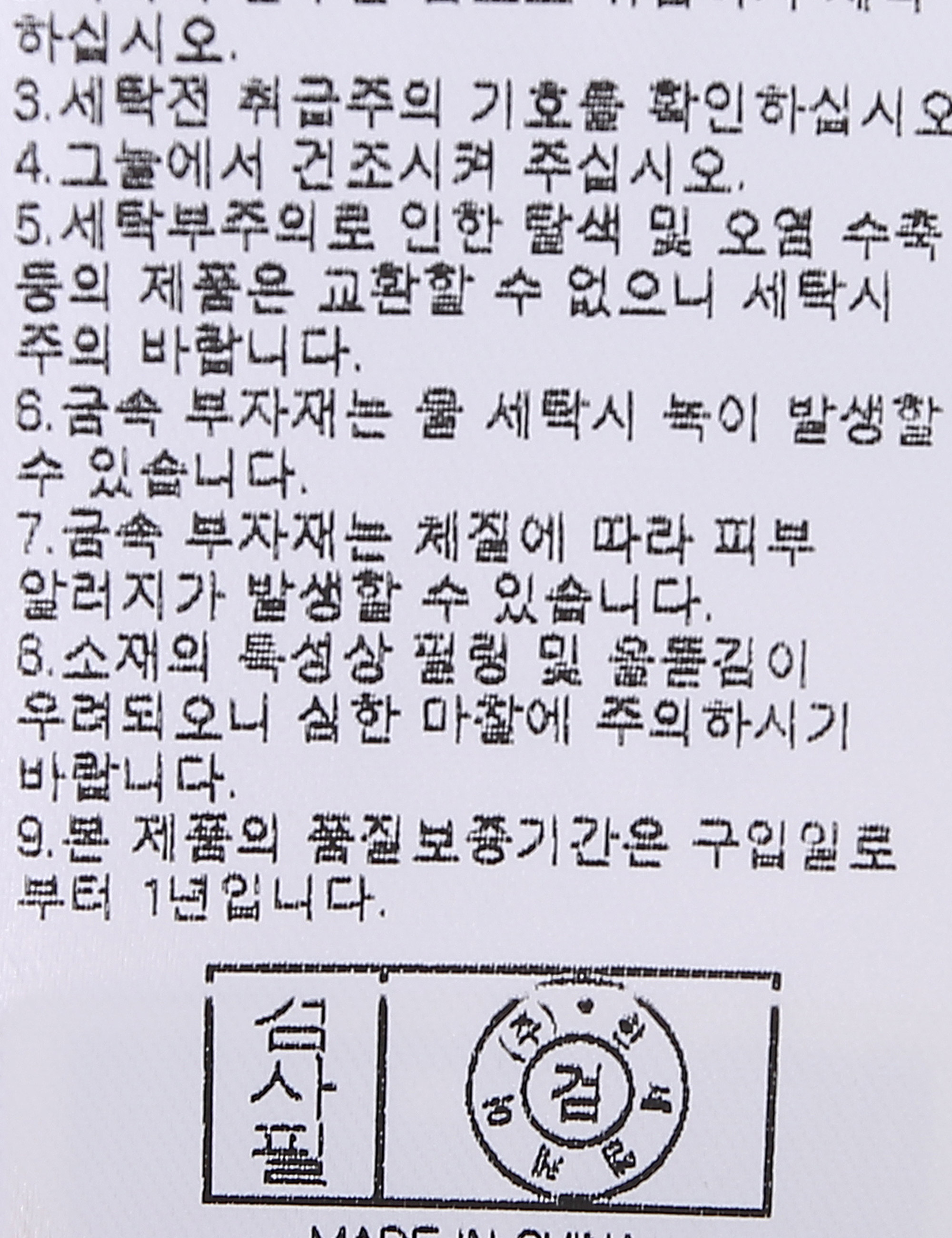 | 세탁방법 및 취급시 주의사항 | 본 제품은 반드시 드라이크리닝 하십시오.(세탁라벨참고) |