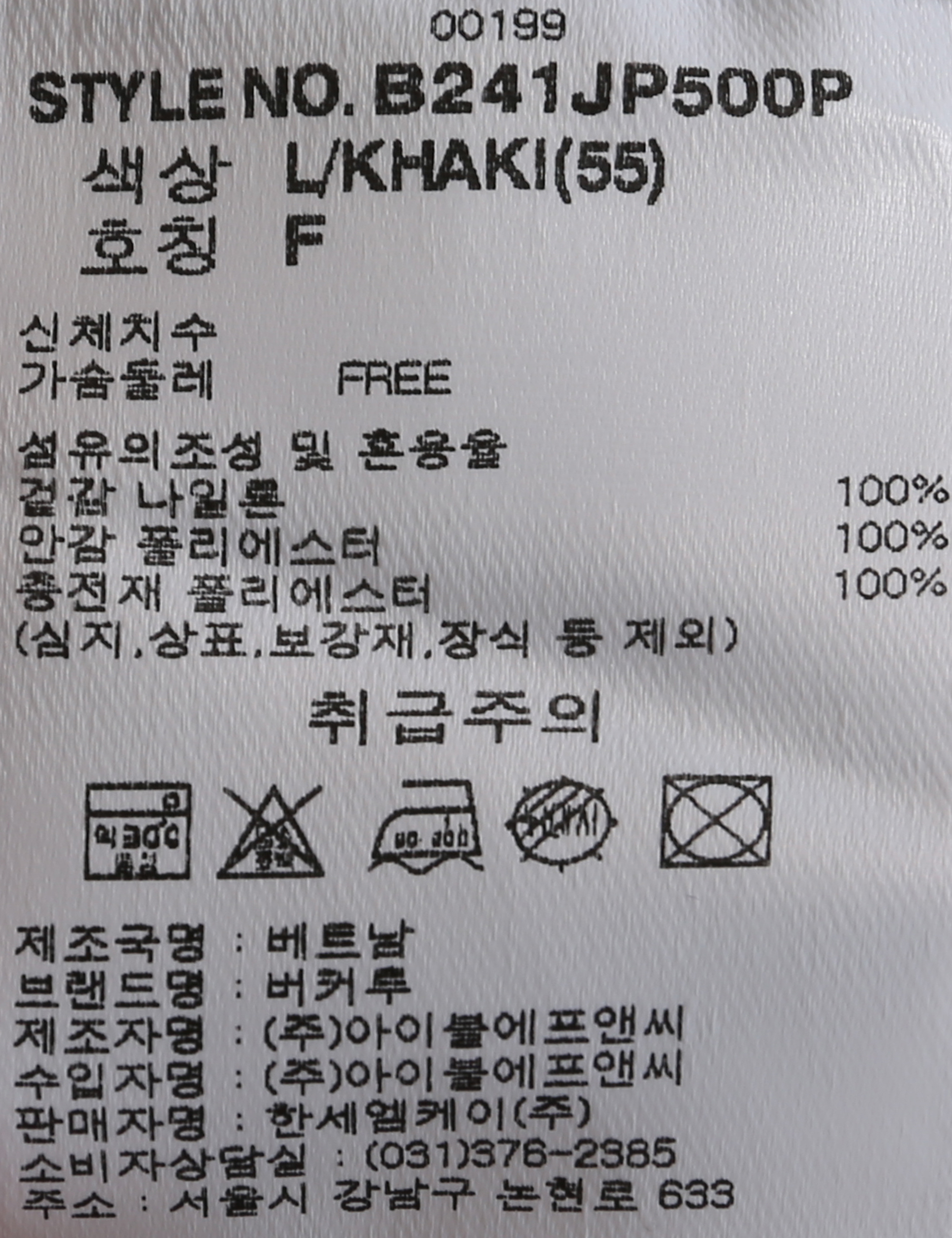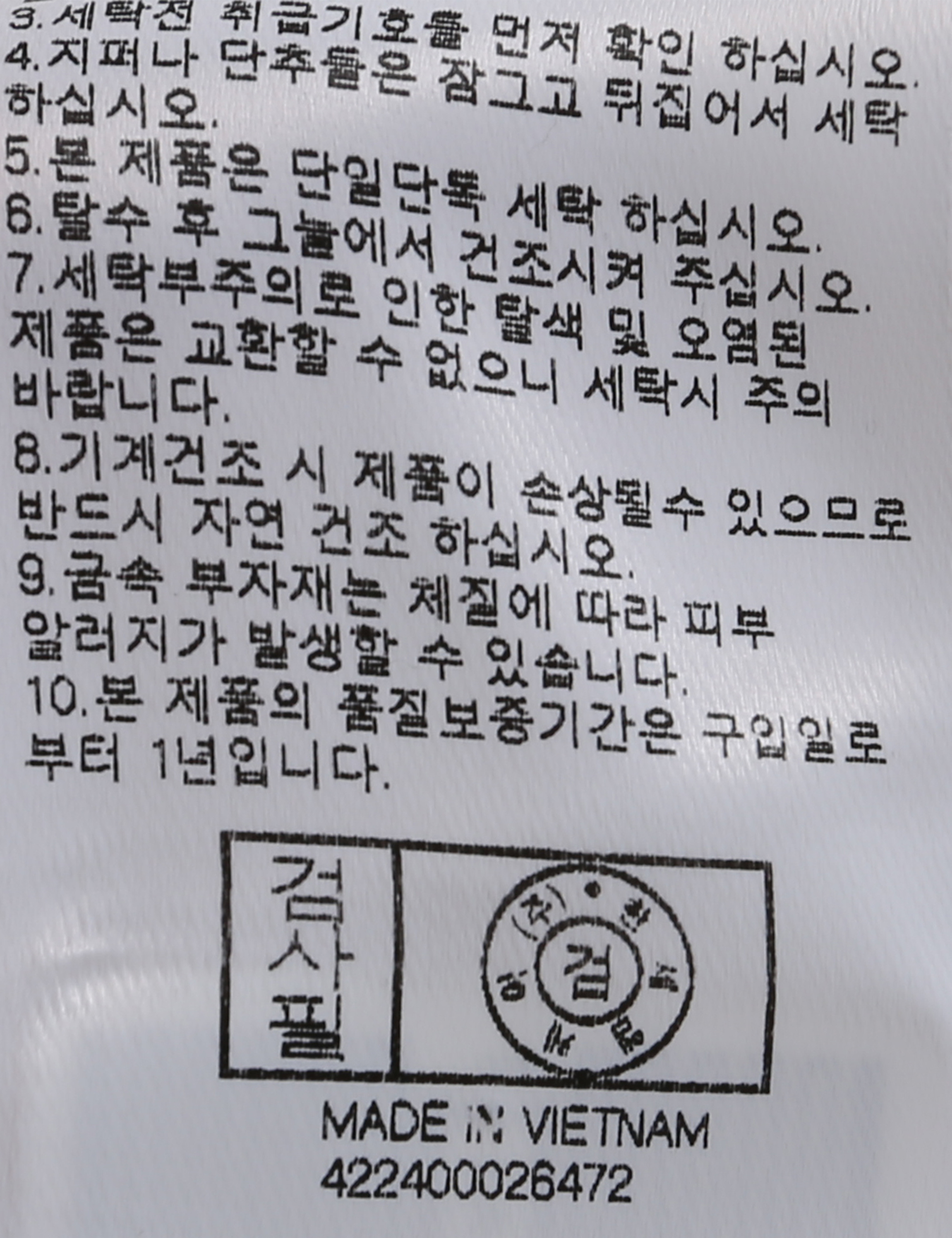 | 세탁방법 및 취급시 주의사항 | 중성세제로 단 시간내에 세탁하십시오.(케어라벨참고) |