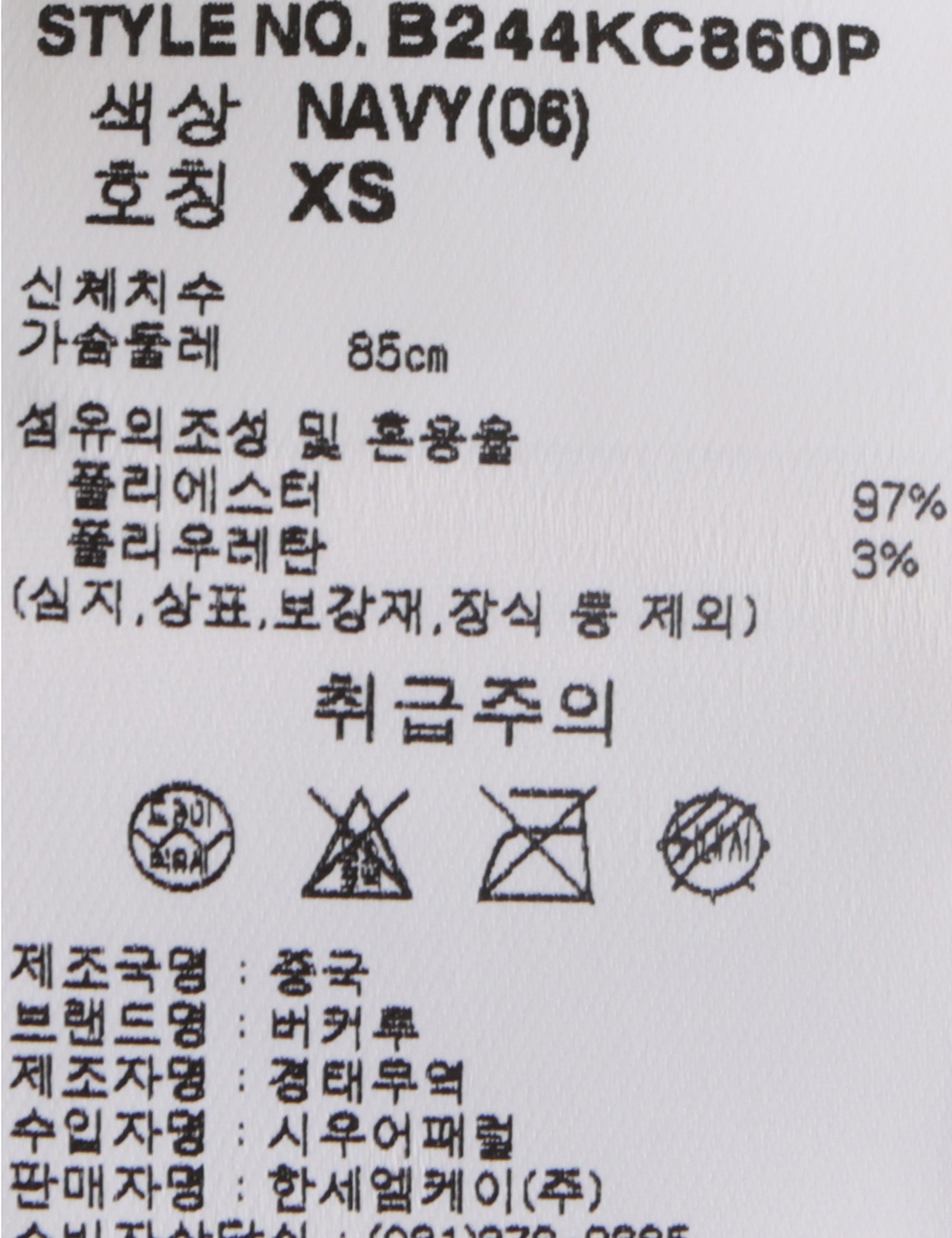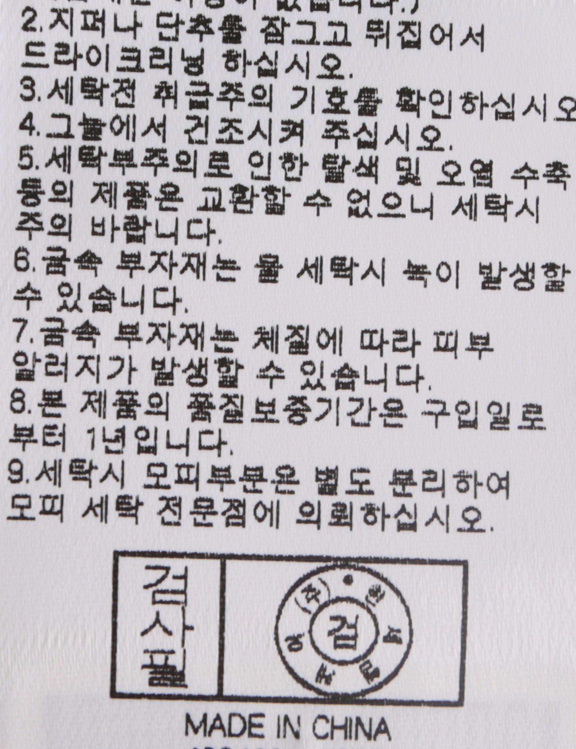 | 세탁방법 및 취급시 주의사항 | 본 제품은 반드시 드라이크리닝 하십시오.(세탁라벨참고) |