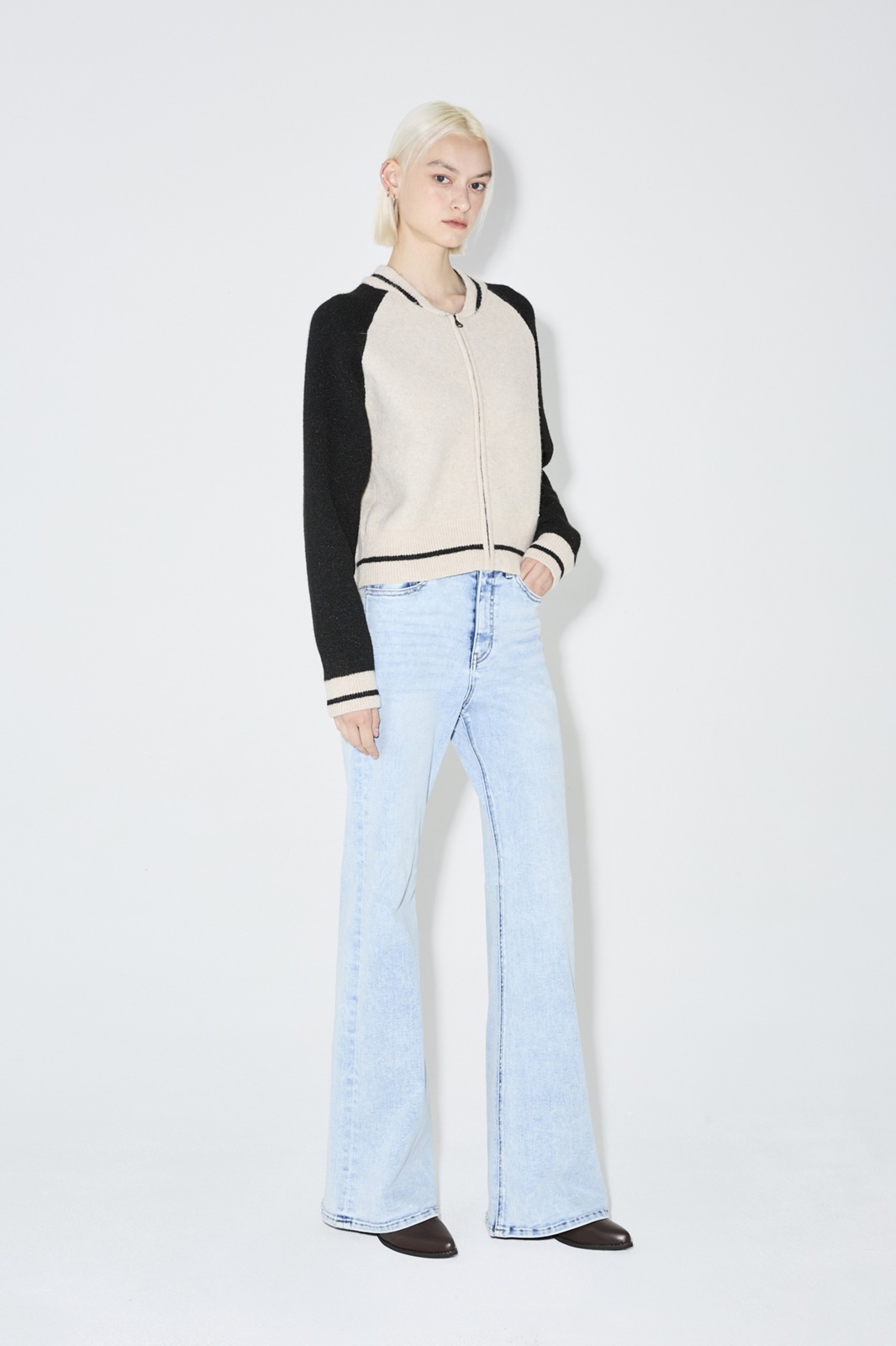 - 소매 배색 디테일로 포인트를 줌