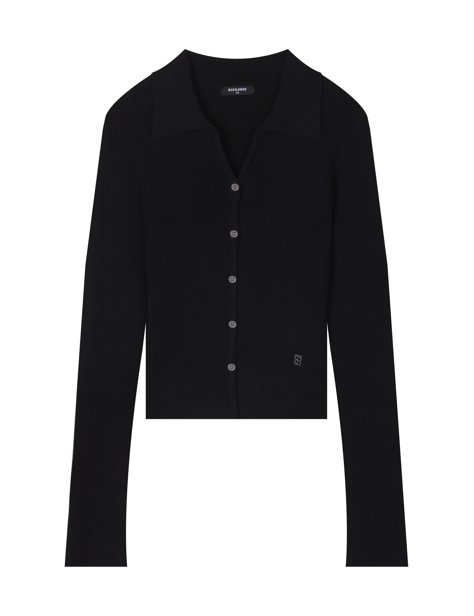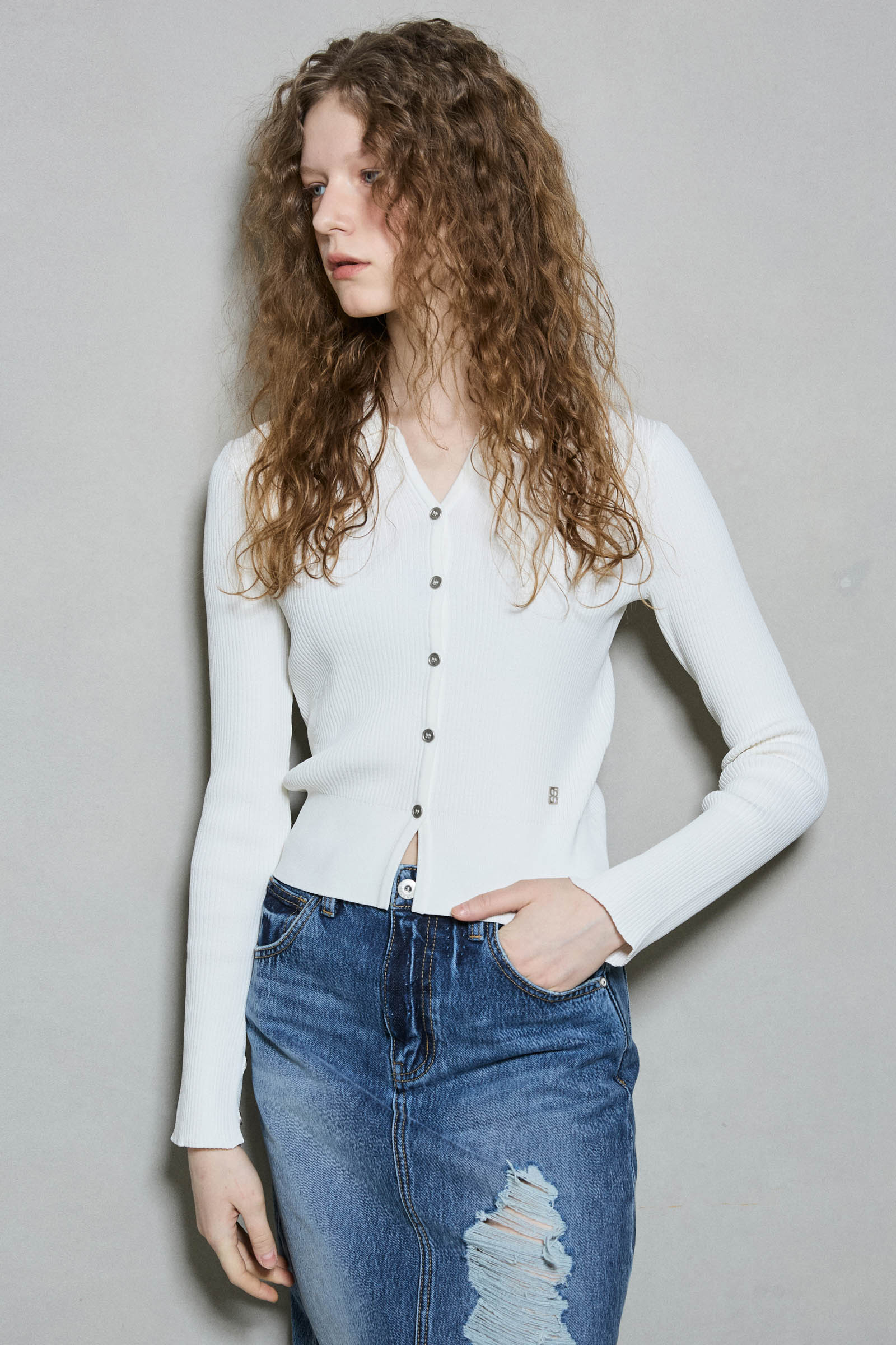 *리브 짜임이 바디에 슬림하게 핏되는 실루엣을 연출하며, 신축성 있는 혼방 소재로 편안하게 착용 가능한 카라 니트 가디건
