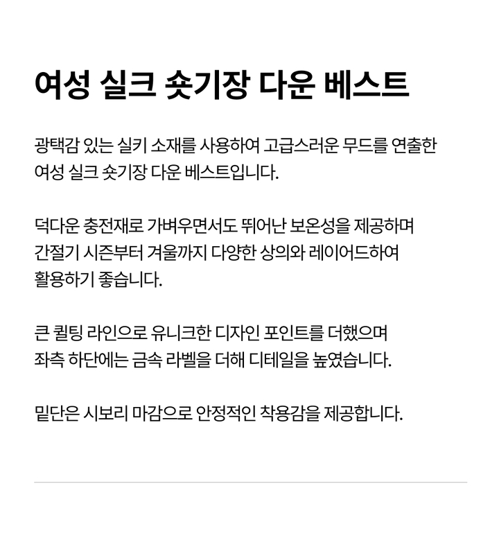 | 상품명 | 여성 실크 숏기장 다운 베스트(B254DW730P) |