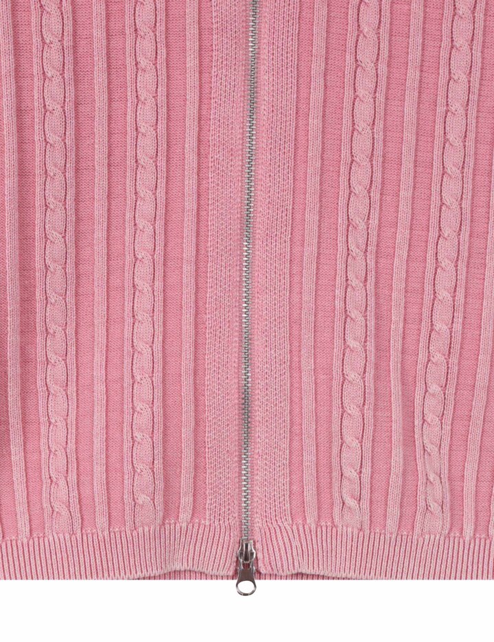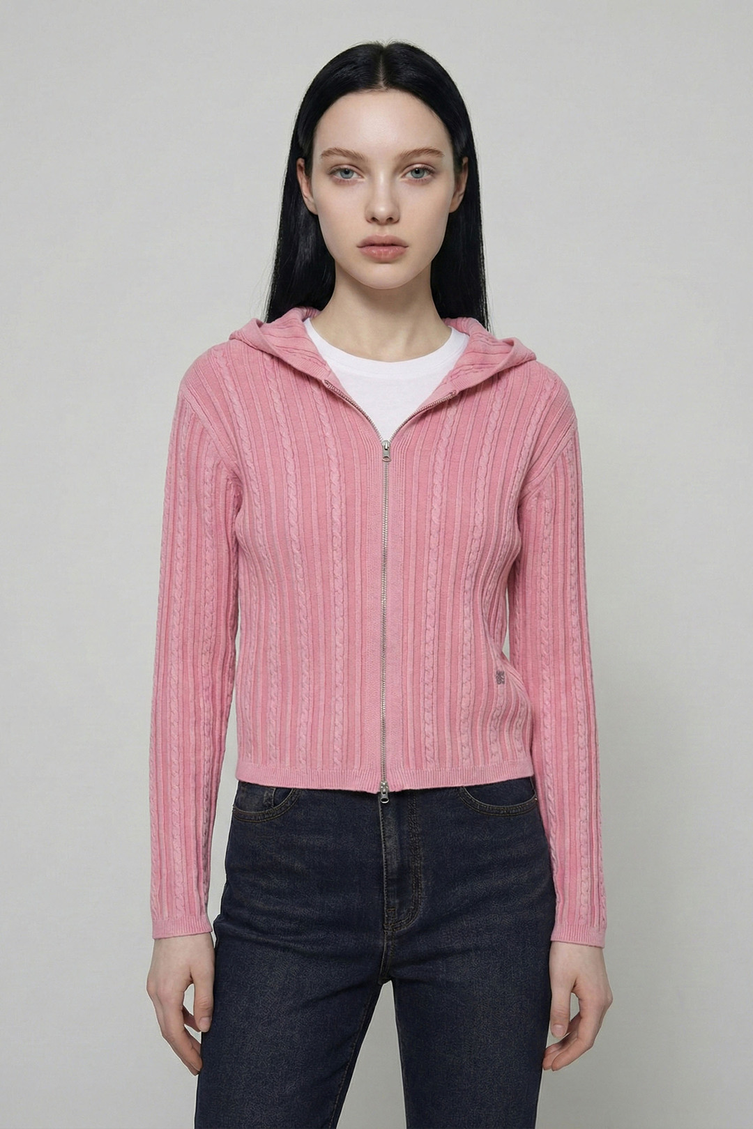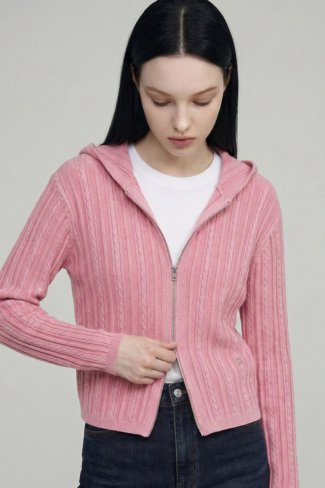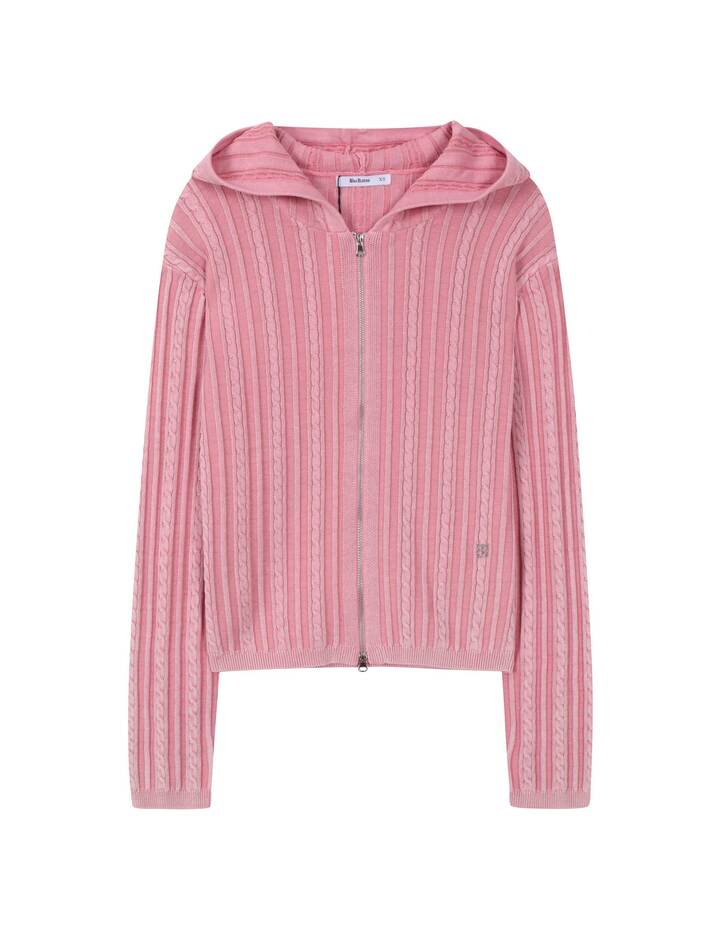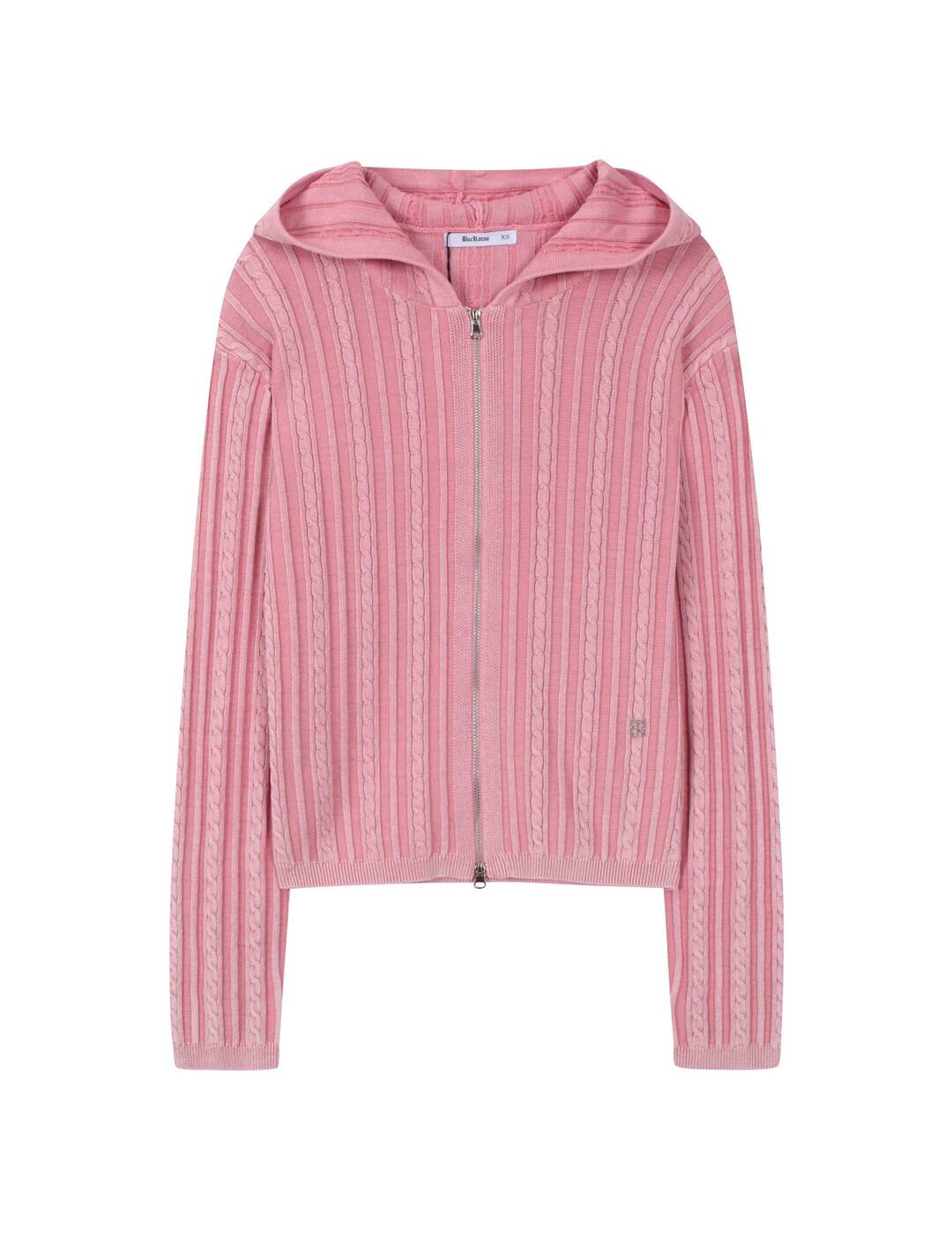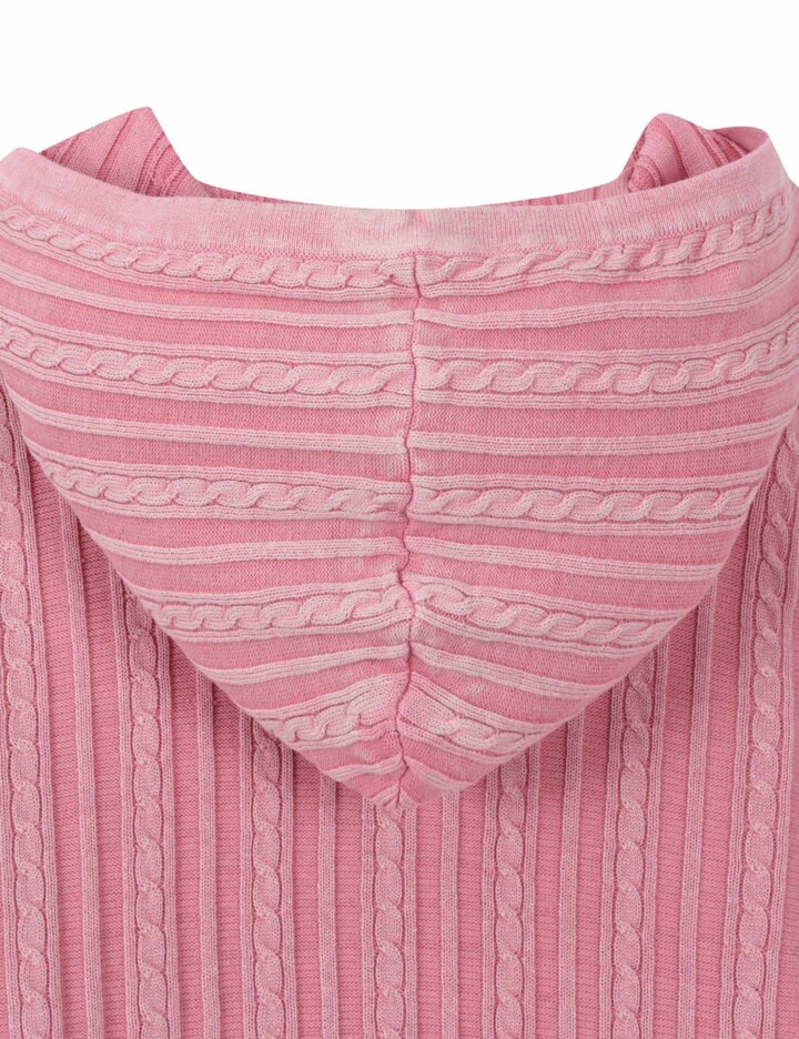 Q1 주요 착용 연령대는 어떻게 되나요? A1 여성 제품이며 XS, S 사이즈로 구성되어 성인 여성 착용에 맞춰 선택할 수 있습니다. Q2 어떤 디자인의 집업인가요? A2 케이블 조직과 다잉 가공으로 빈티지한 감성을 더한 니트 후드 집업입니다. Q3 핏은 어떻게 떨어지나요? A3 루즈 핏으로 여유로운 착용감이 특징입니다. Q4 컬러 옵션은 무엇인가요? A4 PINK, CHARCOAL GREY 컬러로 표기되어 있습니다. Q5 포인트 디테일이 있나요? A5 지퍼 클로징 사양과 좌측 하단 금속 라벨 디테일로 완성도를 더했습니다. Q6 어떤 스타일에 매칭하기 좋나요? A6 캐주얼·데일리 스타일에 매칭이 용이하다고 안내되어 있습니다. Q7 세탁 방법은 어떻게 되나요? A7 드라이클리닝을 권장하며 니트 전용 관리가 안내되어 있습니다.