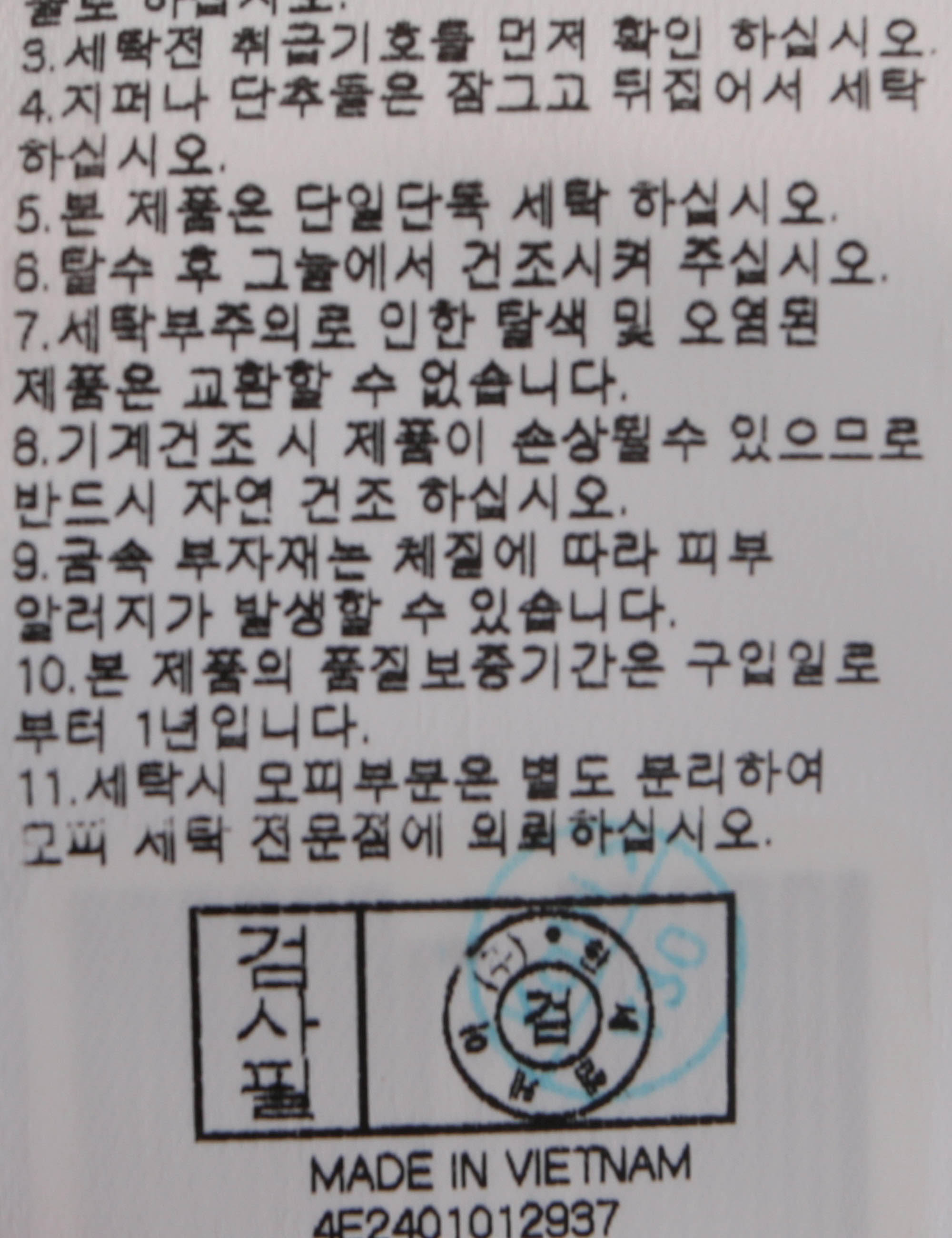 | 세탁방법 및 취급시 주의사항 | 본 제품은 손세탁 하십시오.(케어라벨참고) |