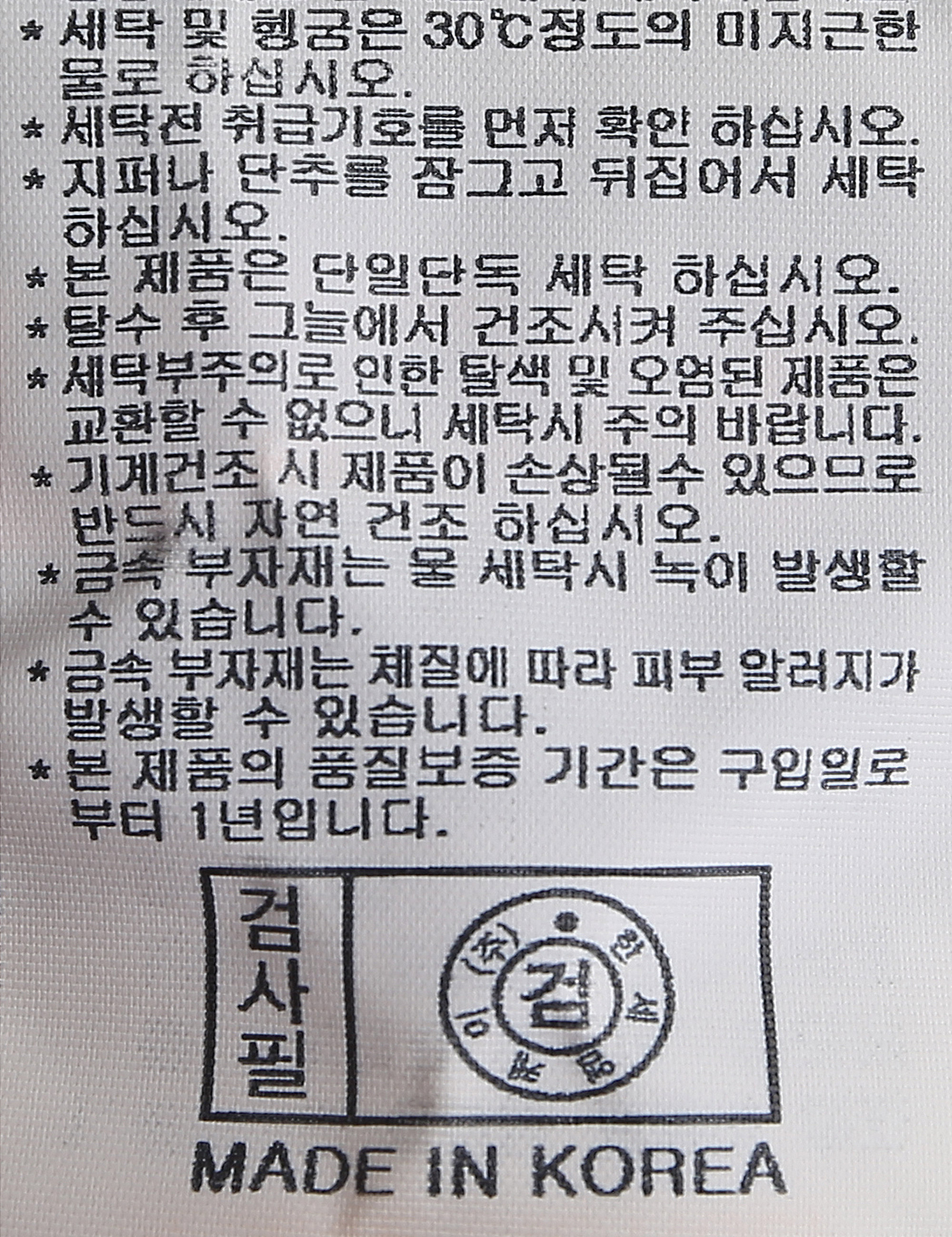 | 세탁방법 및 취급시 주의사항 | 중성세제로 단 시간내에 세탁하십시오.(케어라벨참고) |