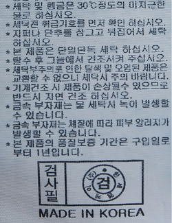 | 세탁방법 및 취급시 주의사항 | 중성세제로 단 시간내에 세탁하십시오.(케어라벨참고) |