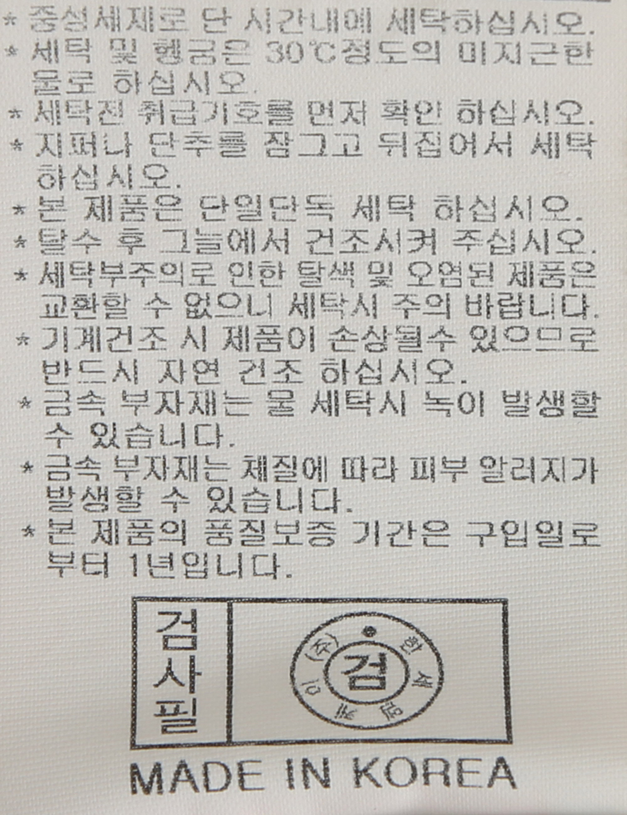| 세탁방법 및 취급시 주의사항 | 중성세제로 단 시간내에 세탁하십시오.(케어라벨참고) |
