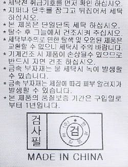 | 세탁방법 및 취급시 주의사항 | 중성세제로 단 시간내에 세탁하십시오.(케어라벨참고) |