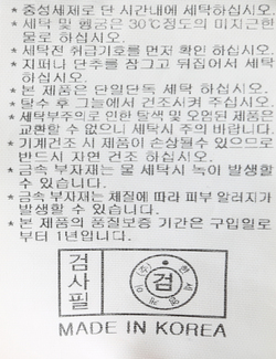 | 세탁방법 및 취급시 주의사항 | 중성세제로 단 시간내에 세탁하십시오.(케어라벨참고) |