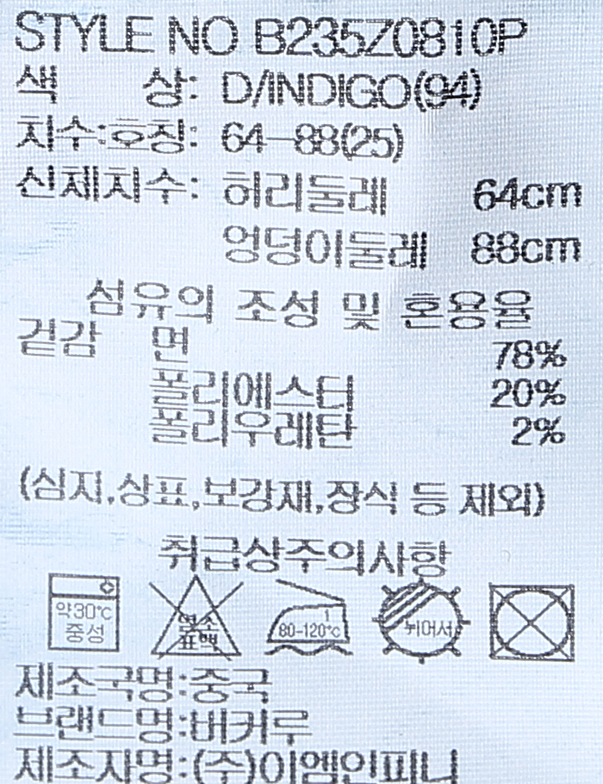 제품소재 [겉감]면70% 폴리에스터20% 레이온8% 폴리우레탄2%