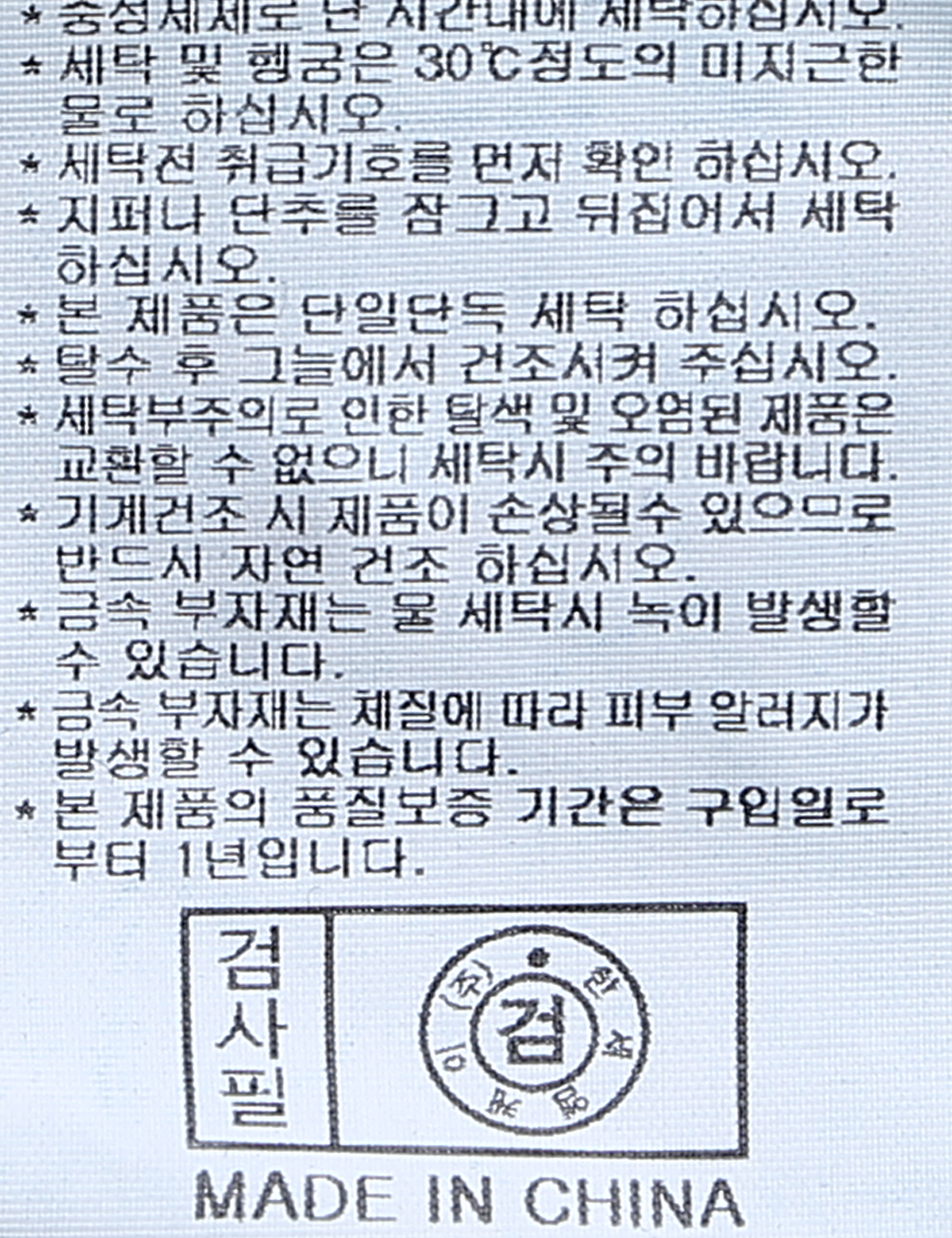 세탁방법 및 취급시 주의사항 중성세제로 단 시간내에 세탁하십시오.(케어라벨참고)