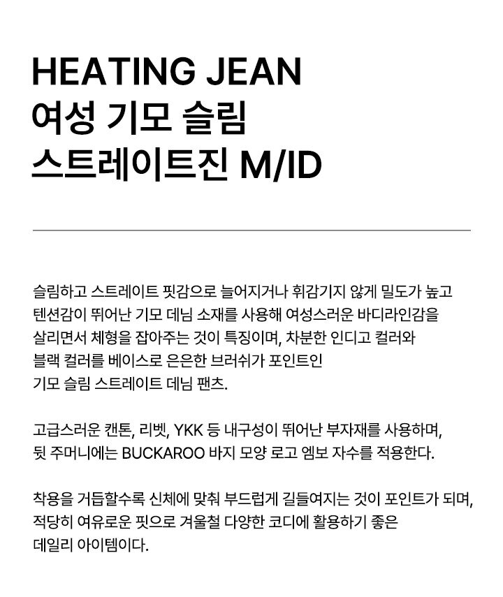 | 상품명 | [HEATING JEAN] 여성 기모 슬림 스트레이트진 M/BK(B244Z0640P) |