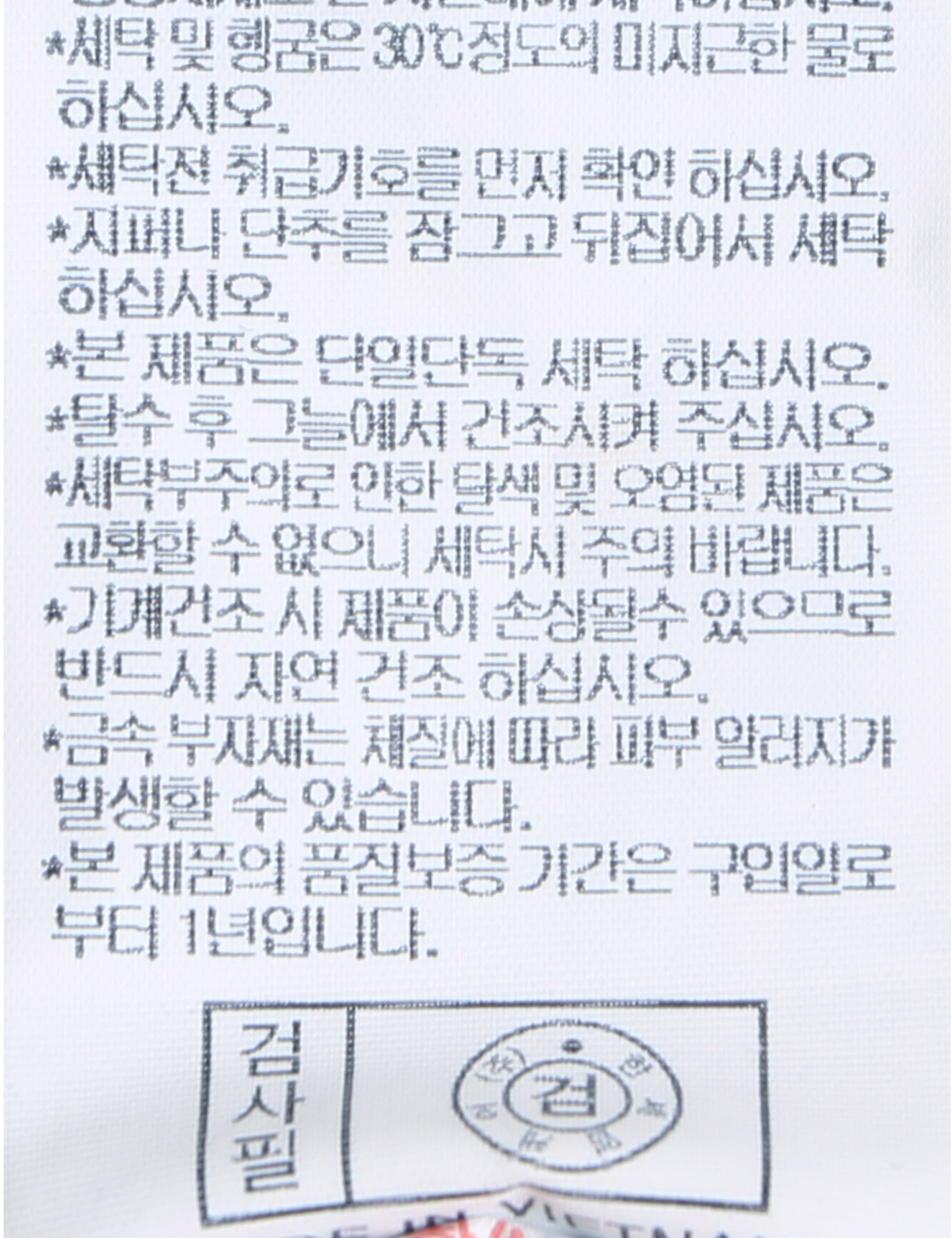 | 세탁방법 및 취급시 주의사항 | 본 제품은 손세탁 하십시오.(케어라벨참고) |