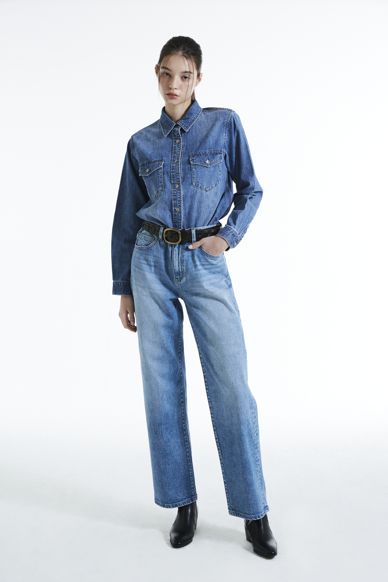 빈티지스러우며 깊이감 있는 데님 와이드 팬츠.