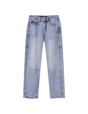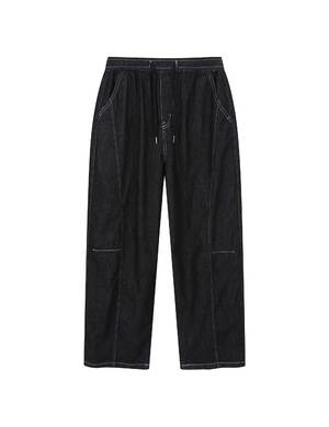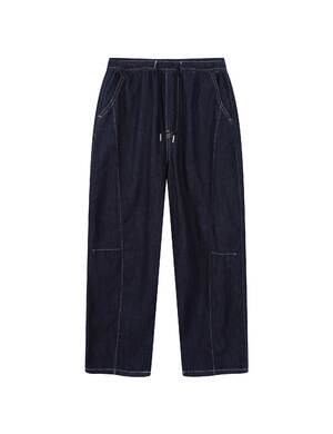 무릎위치에 턱을 잡아 편안한 착용감과 입체적인 실루엣을 표현한 데님 파라슈트 카고 팬츠