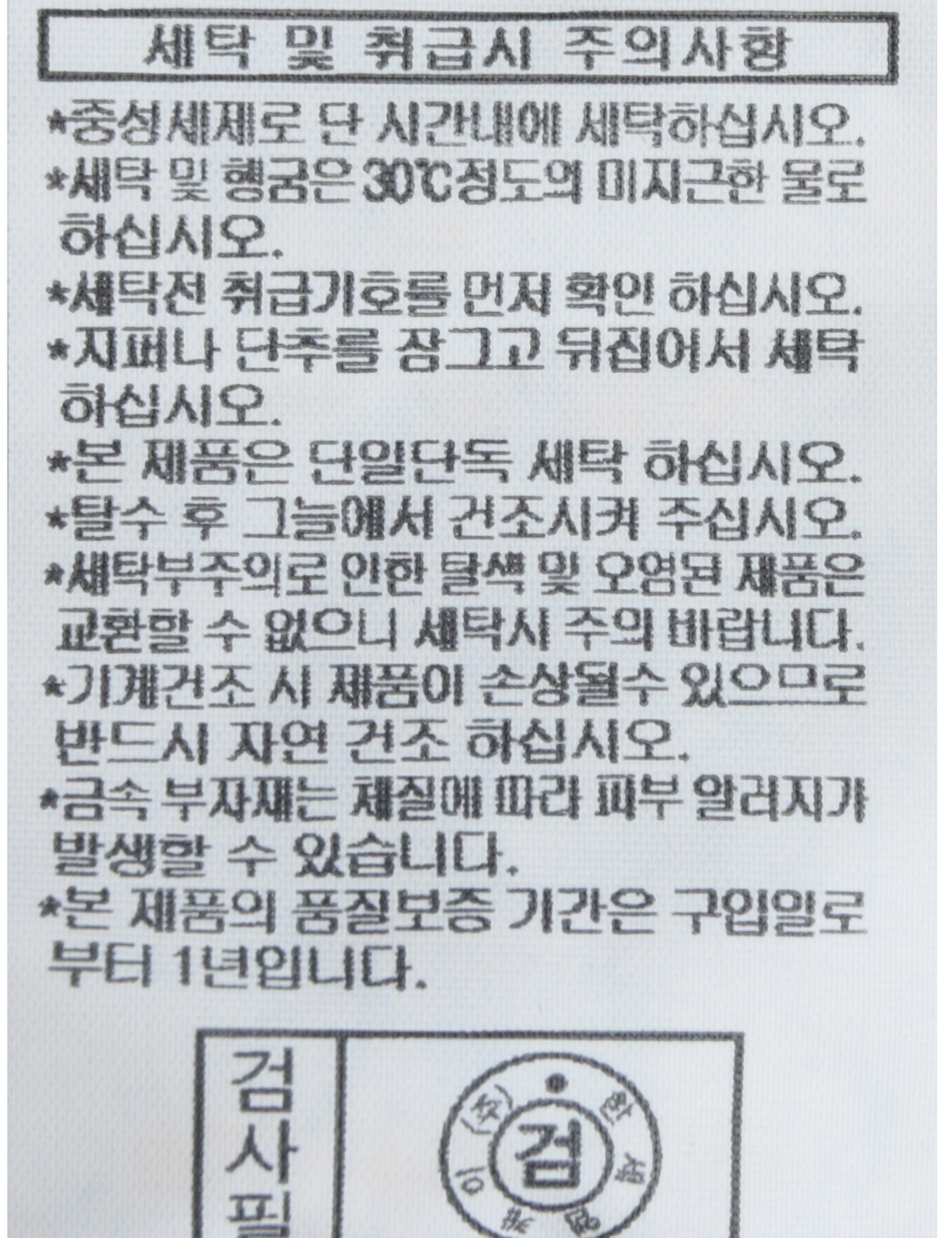 | 세탁방법 및 취급시 주의사항 | 중성세제로 단 시간내에 세탁하십시오.(케어라벨참고) |