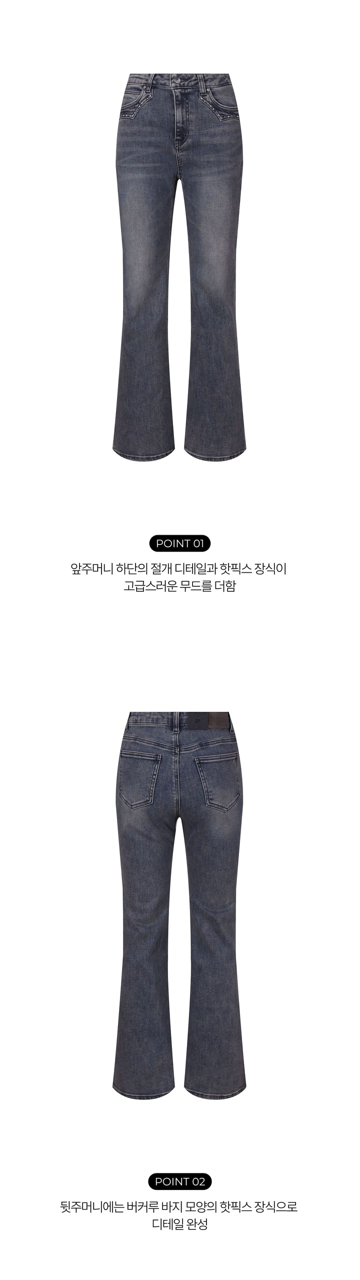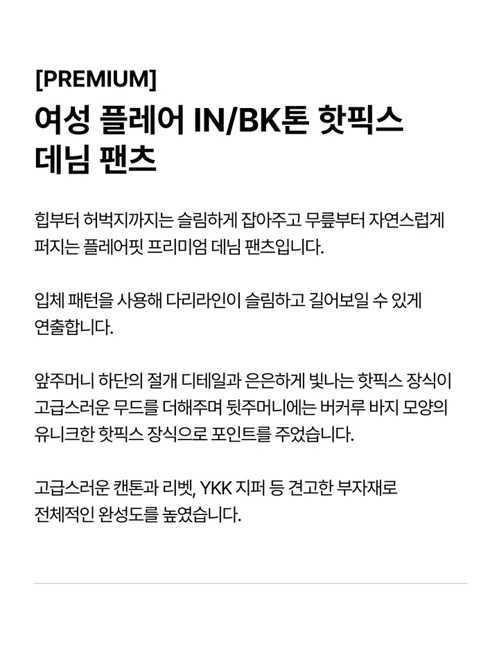 | 상품명 | [PREMIUM] 여성 플레어 IN/BK톤 핫픽스 데님 팬츠(B265DP751P) |