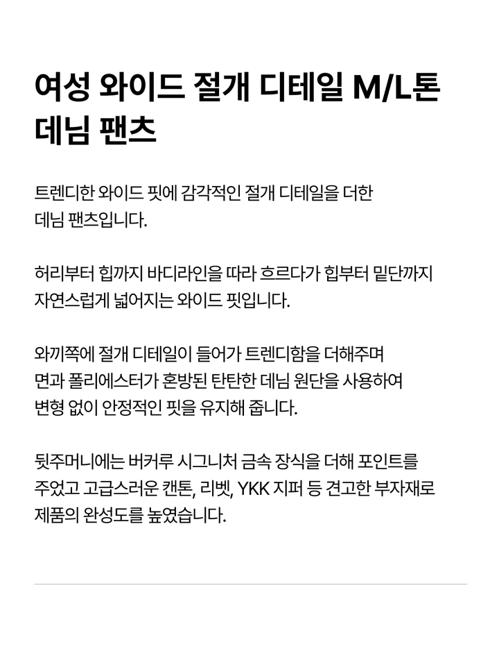 | 상품명 | 여성 와이드 절개 디테일 M/L톤 데님 팬츠(B265DP818P) |