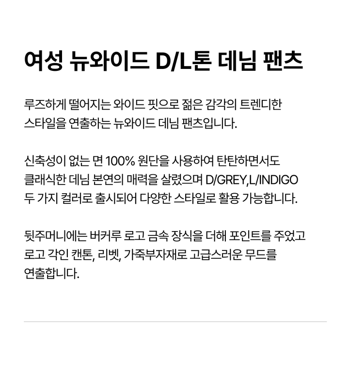 | 상품명 | 여성 뉴와이드 D/L톤 데님 팬츠(B265DP822P) |
