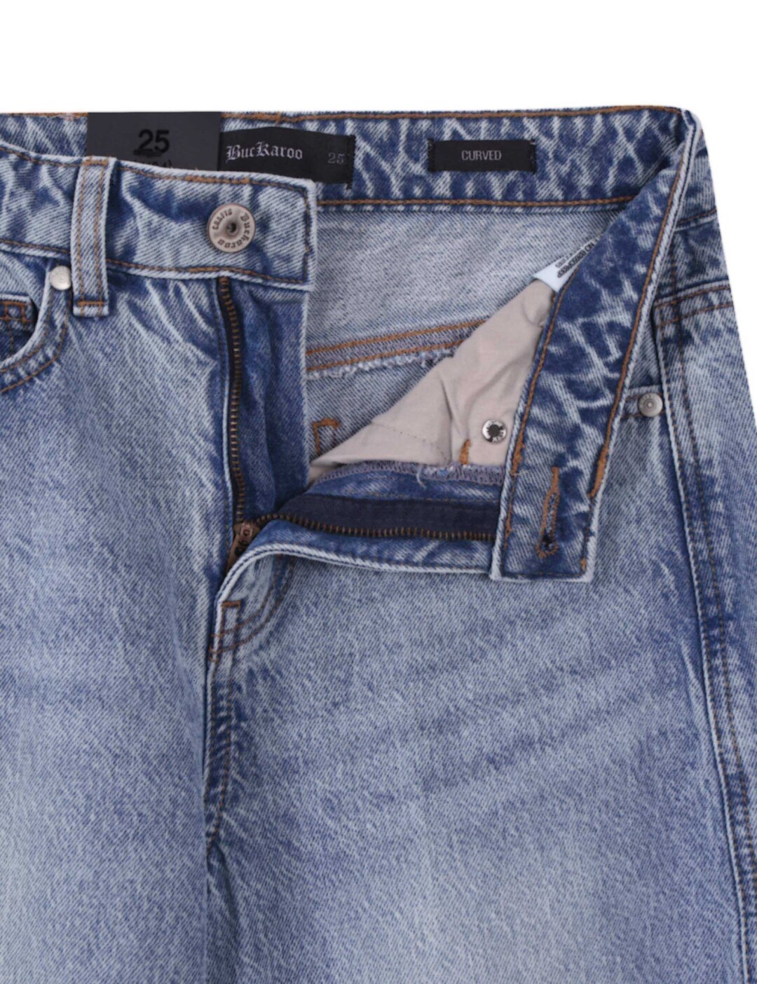 힙에서 무릎까지는 여유 있게, 밑단으로 갈수록 자연스럽게 좁아지는 커브드 핏 데님 팬츠입니다.
