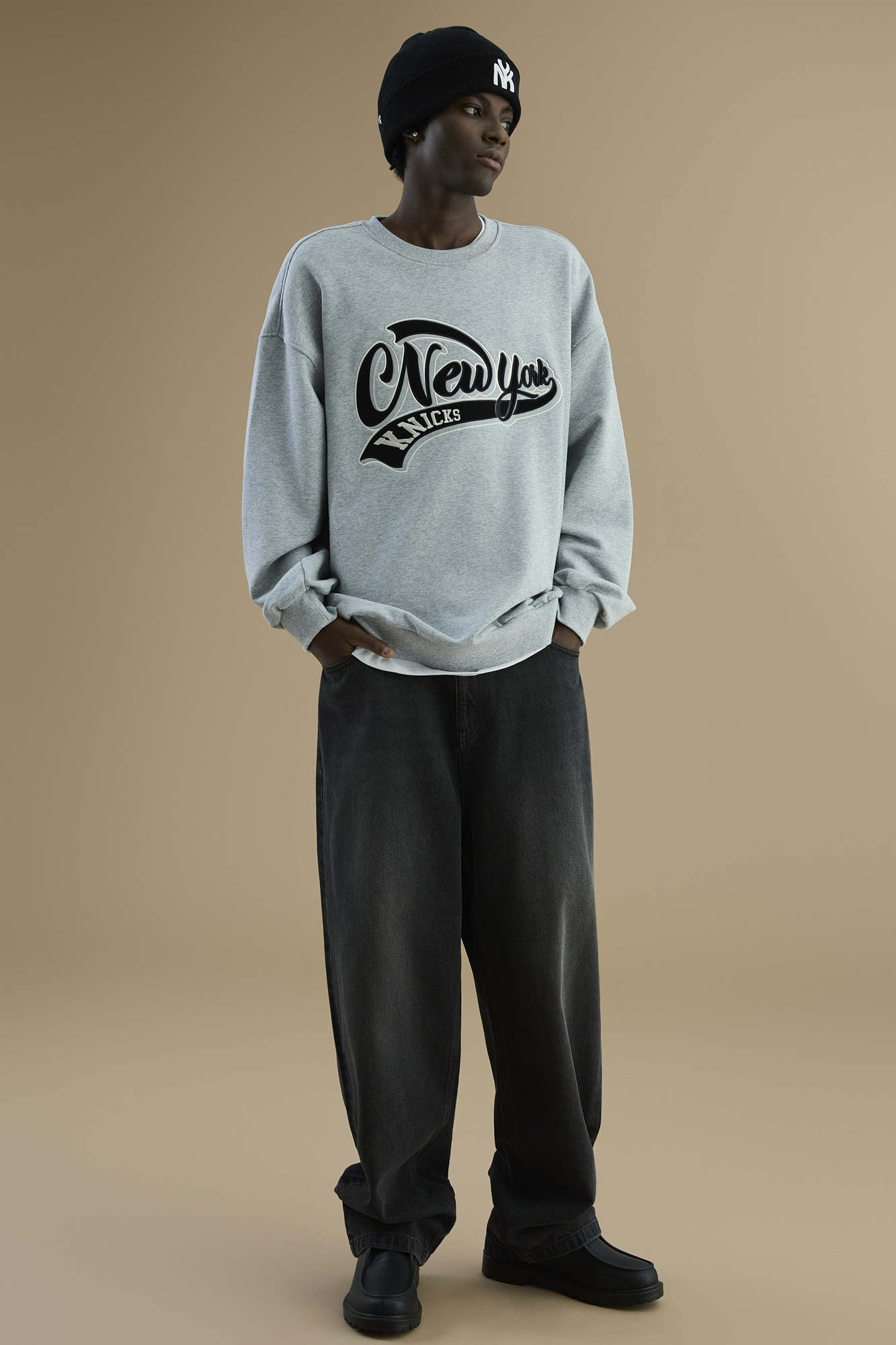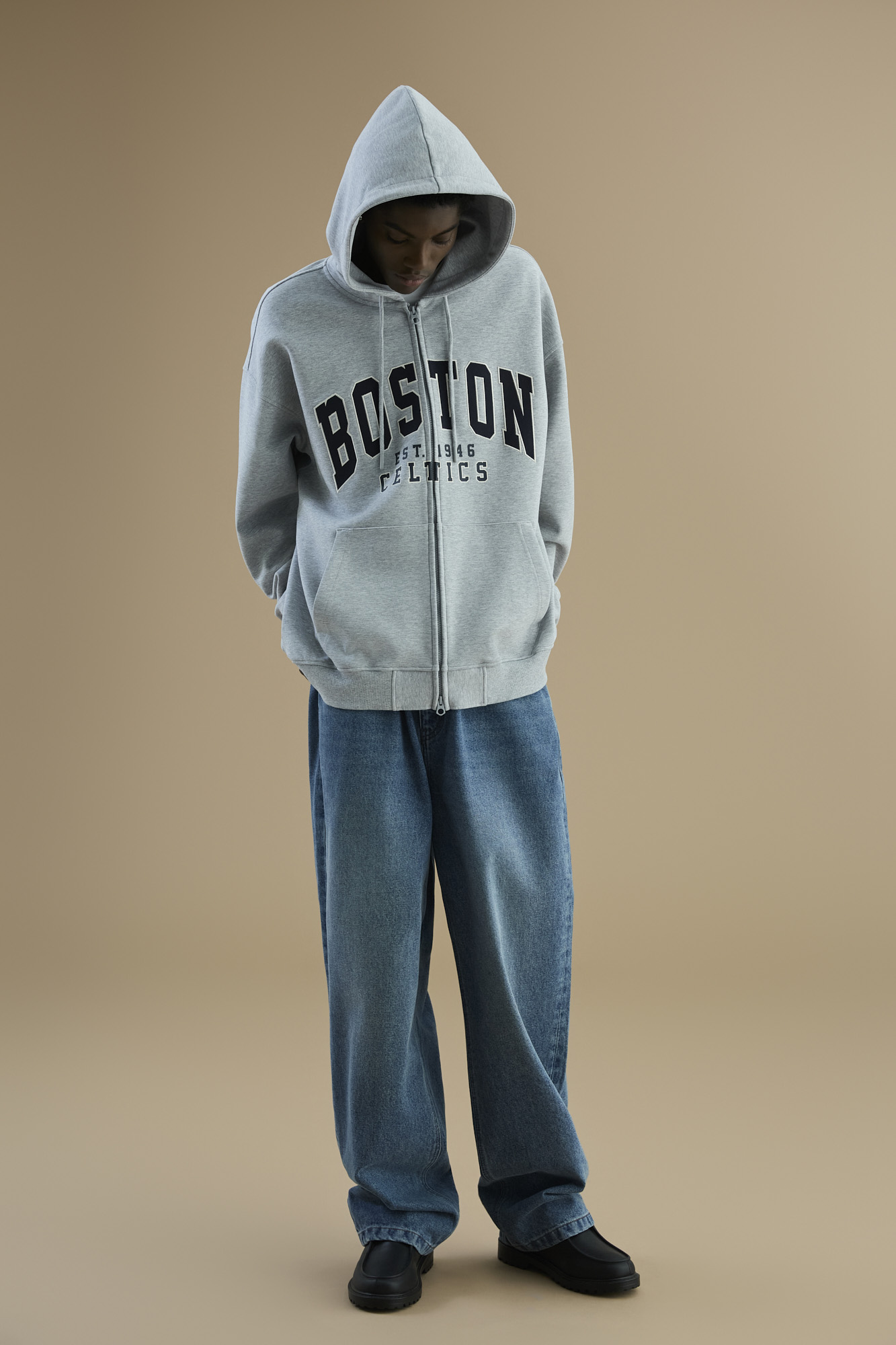 - 전체적으로 넉넉한 사이즈로 작업 된 와이드핏으로 무릎부터 자연스럽게 밑단이 좁아지는 핏