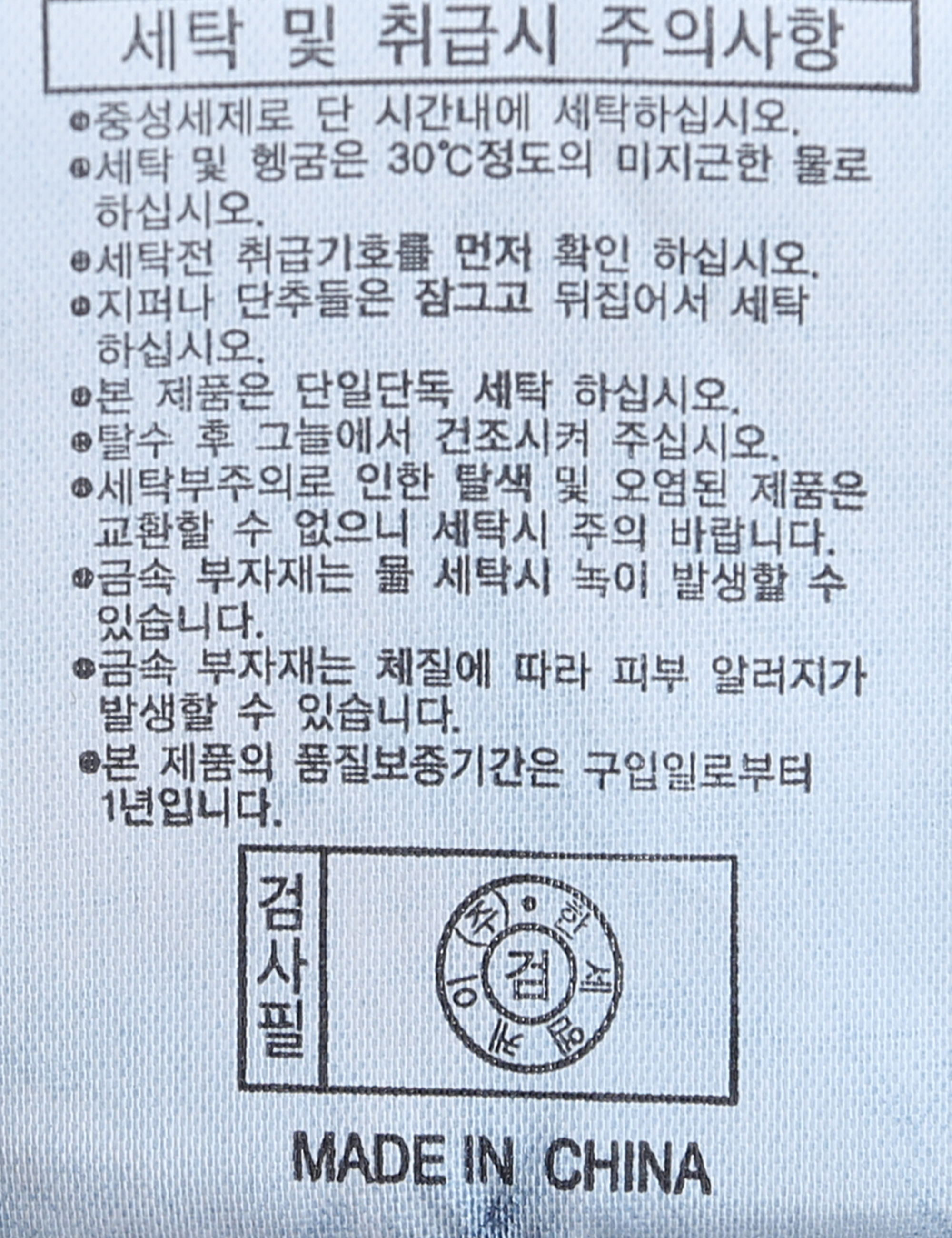 | 세탁방법 및 취급시 주의사항 | 중성세제로 단 시간내에 세탁하십시오.(케어라벨참고) |
