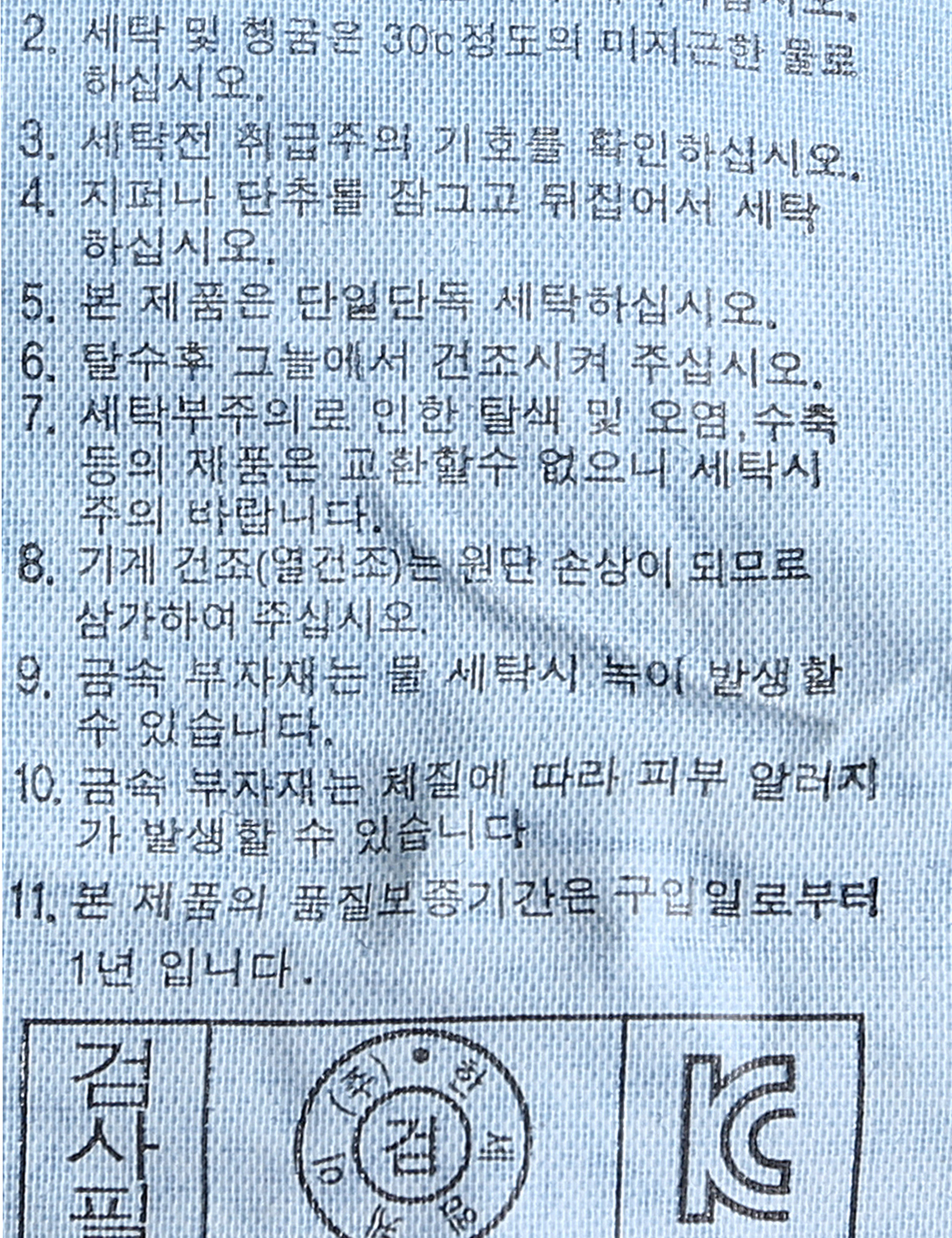 | 세탁방법 및 취급시 주의사항 | 본 제품은 손세탁 하십시오.(케어라벨참고) |