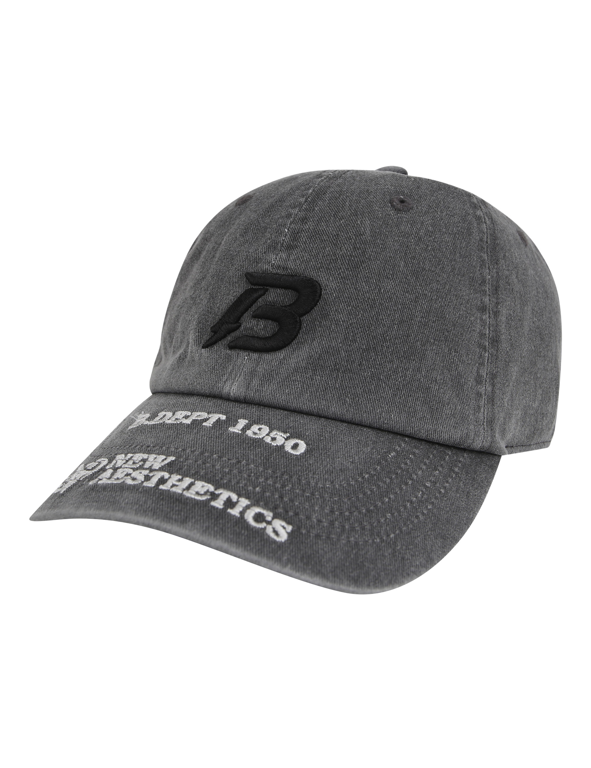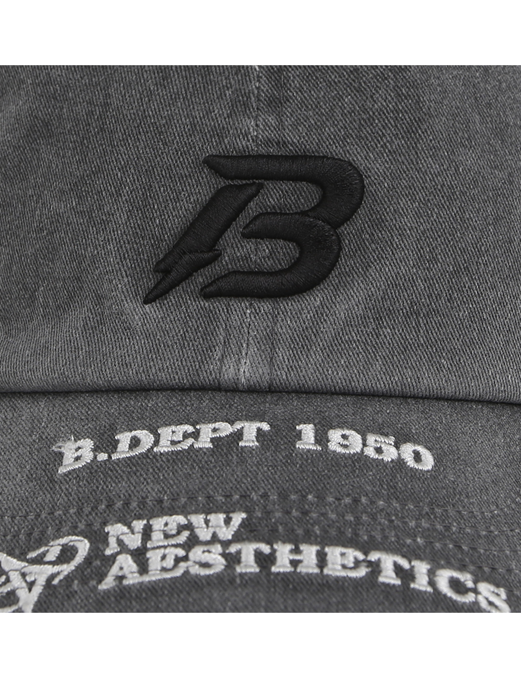 피그먼트 소재를 활용하여 마치 다잉한 듯한 연출을 하는 버커루 로고 플레이 자수 볼캡.