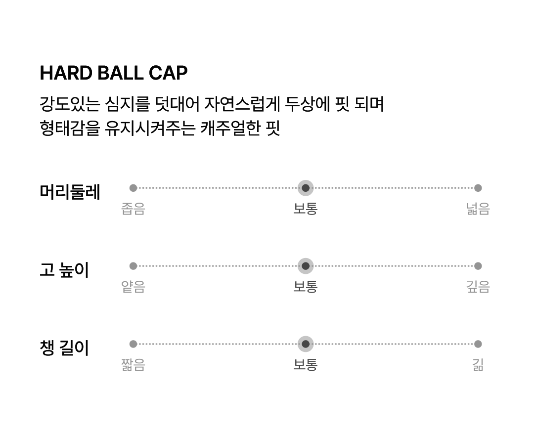 정사이즈 착용 시 안정적인 실루엣을 제공 둘레: 58.5 / 높이: 16.5 / 챙길이: 7.5