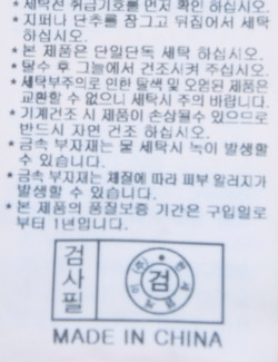 | 세탁방법 및 취급시 주의사항 | 중성세제로 단 시간내에 세탁하십시오.(케어라벨참고) |