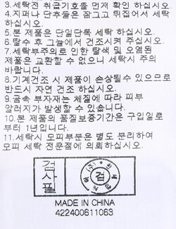 | 세탁방법 및 취급시 주의사항 | 중성세제로 단 시간내에 세탁하십시오.(케어라벨참고) |