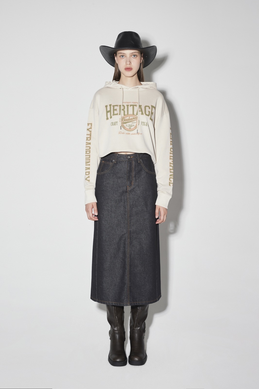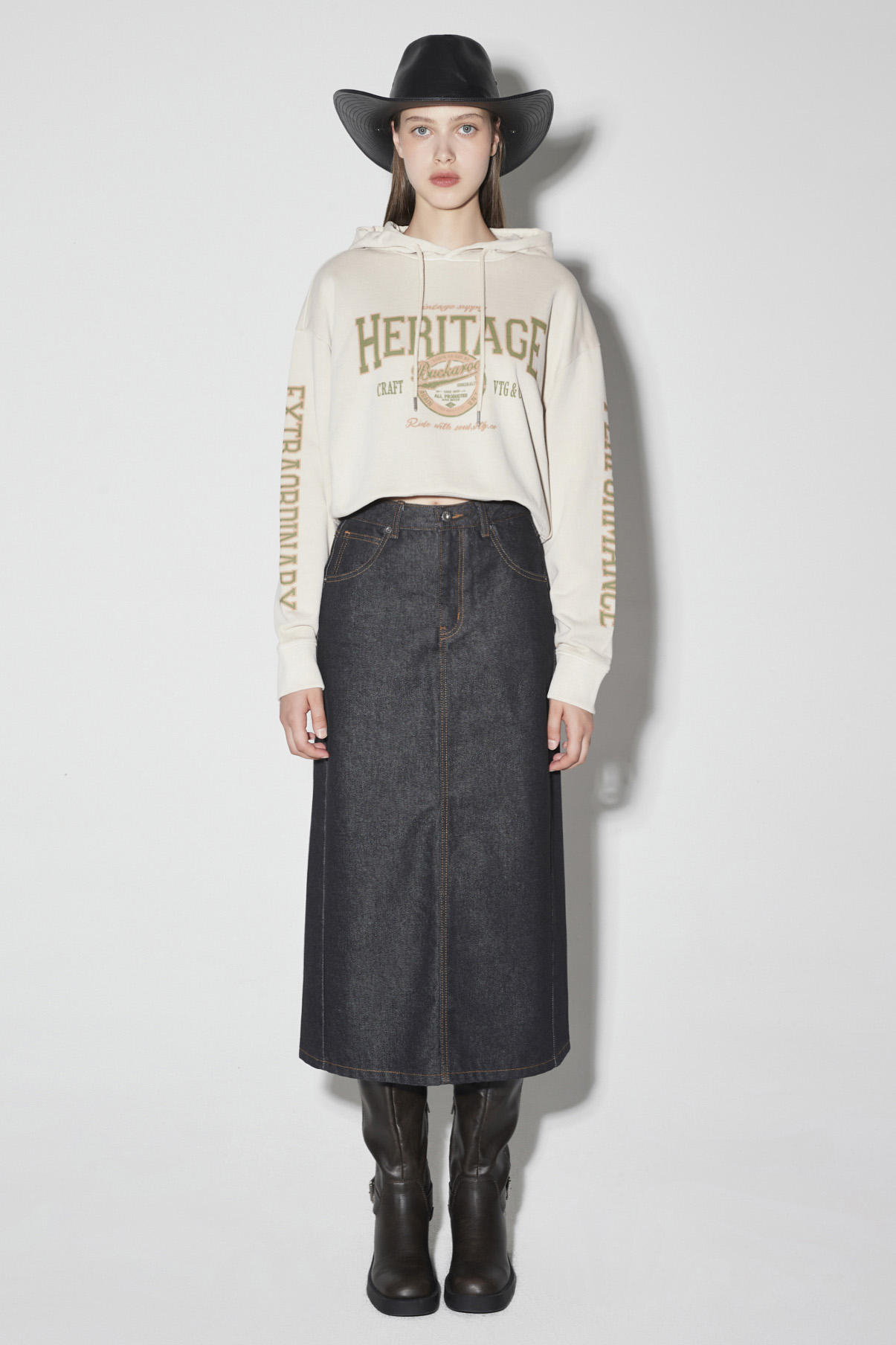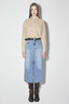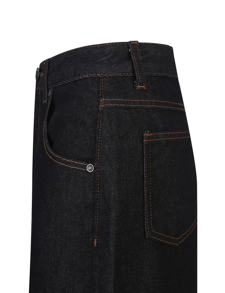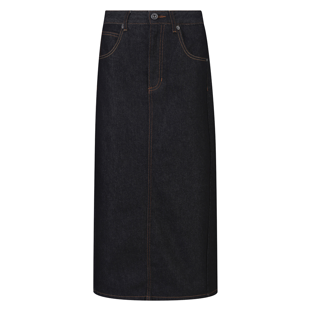 * 롱 기장감의 스커트로 옆선 절개라인을 사선으로 디자인하여 포인트 디테일을 주었으며 데일리룩으로 스타일링하기 유용한 데님 롱 스커트.