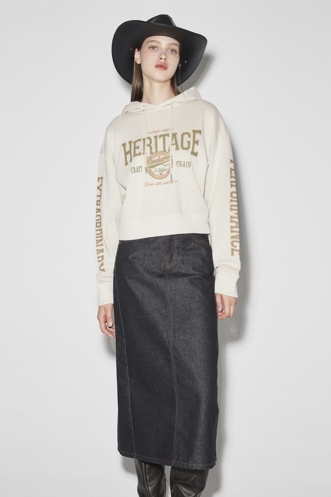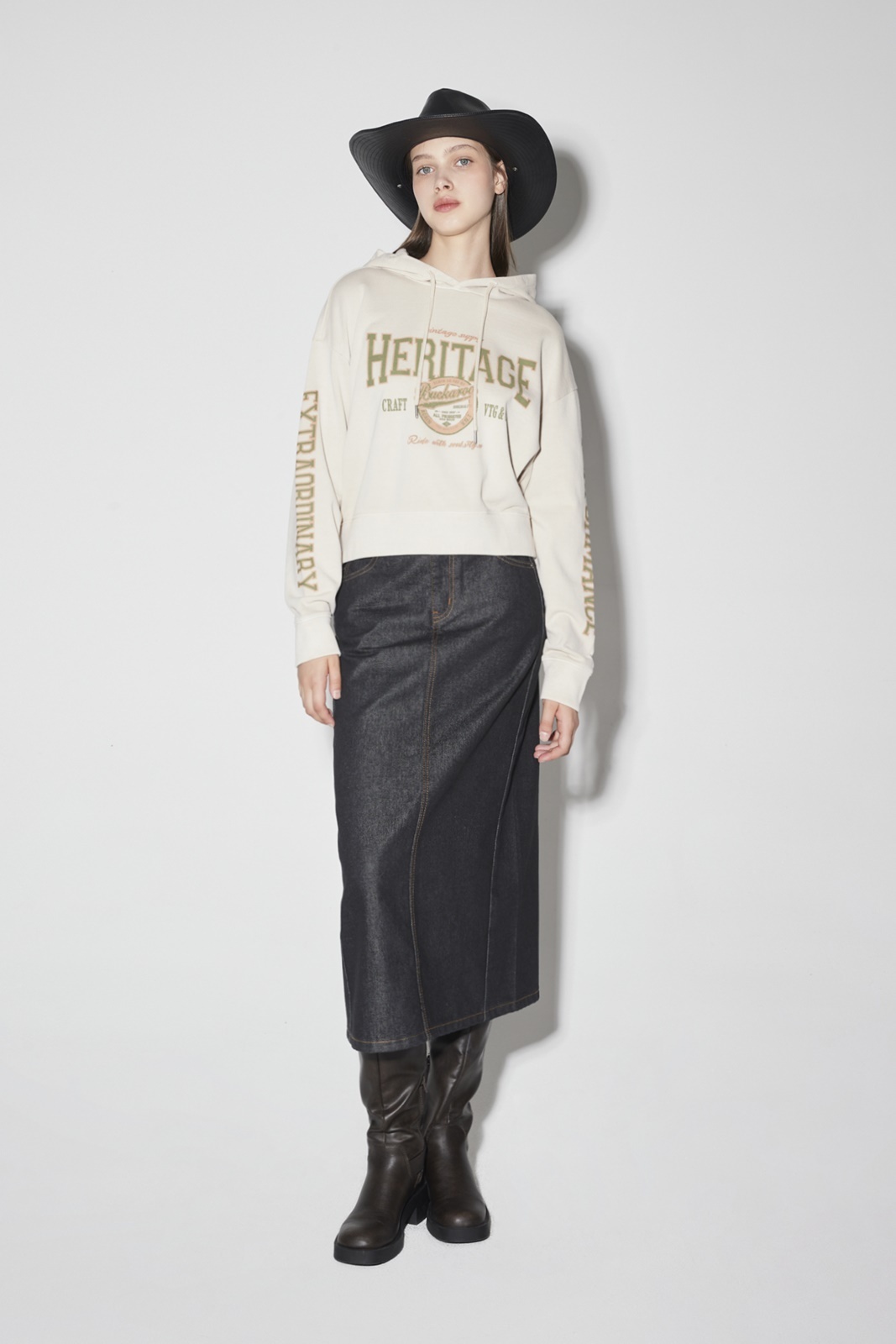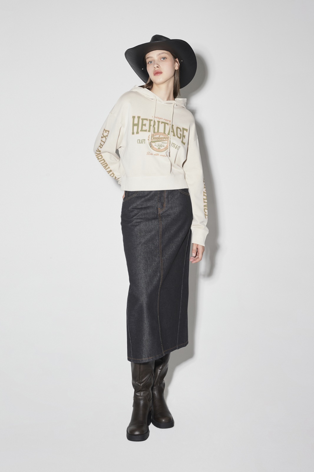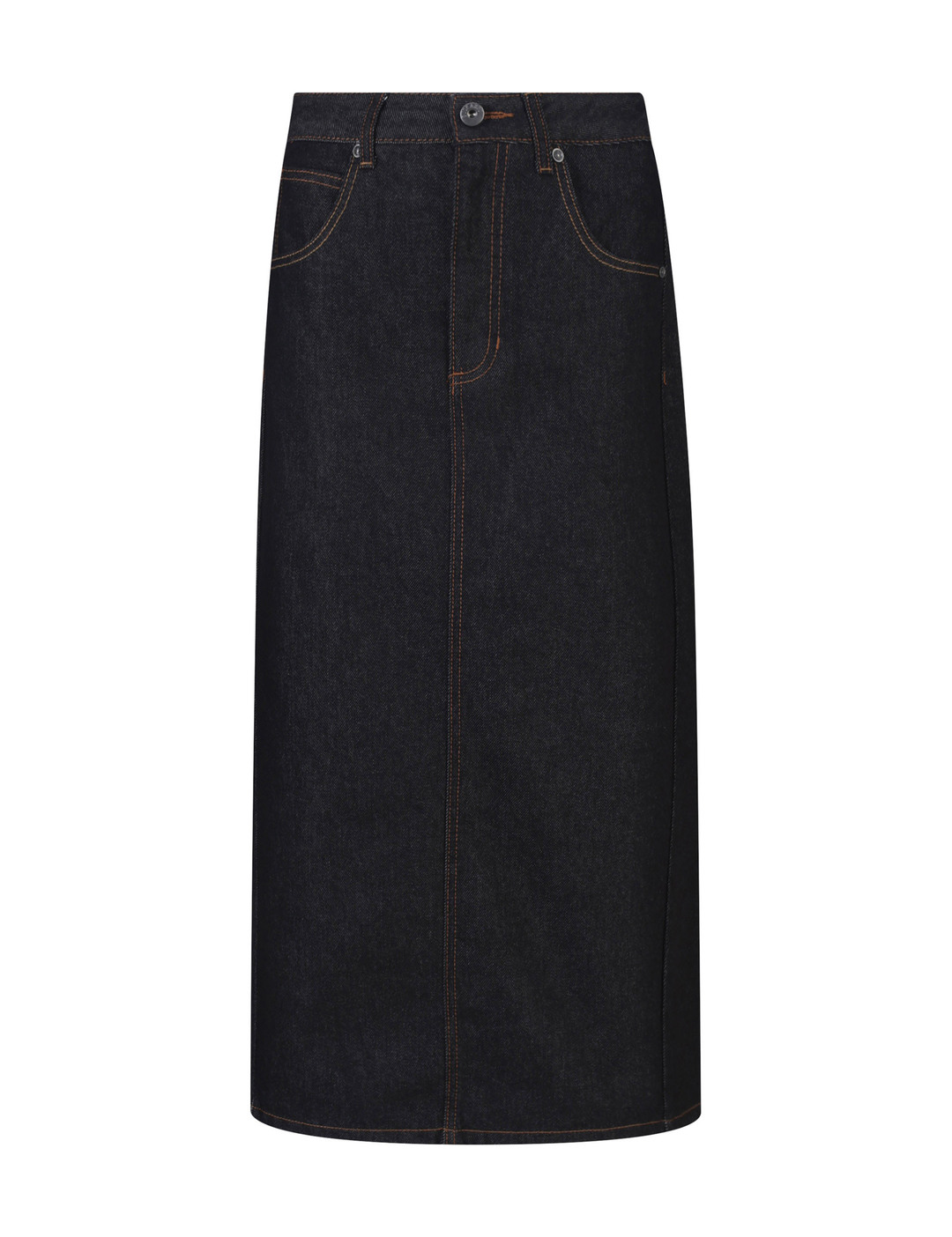 * 롱 기장감의 스커트로 옆선 절개라인을 사선으로 디자인하여 포인트 디테일을 주었으며 데일리룩으로 스타일링하기 유용한 데님 롱 스커트.