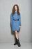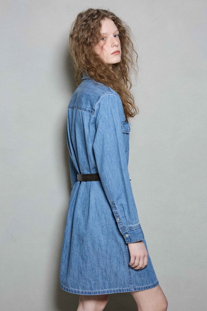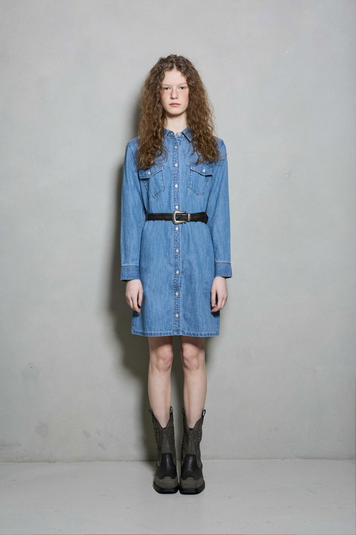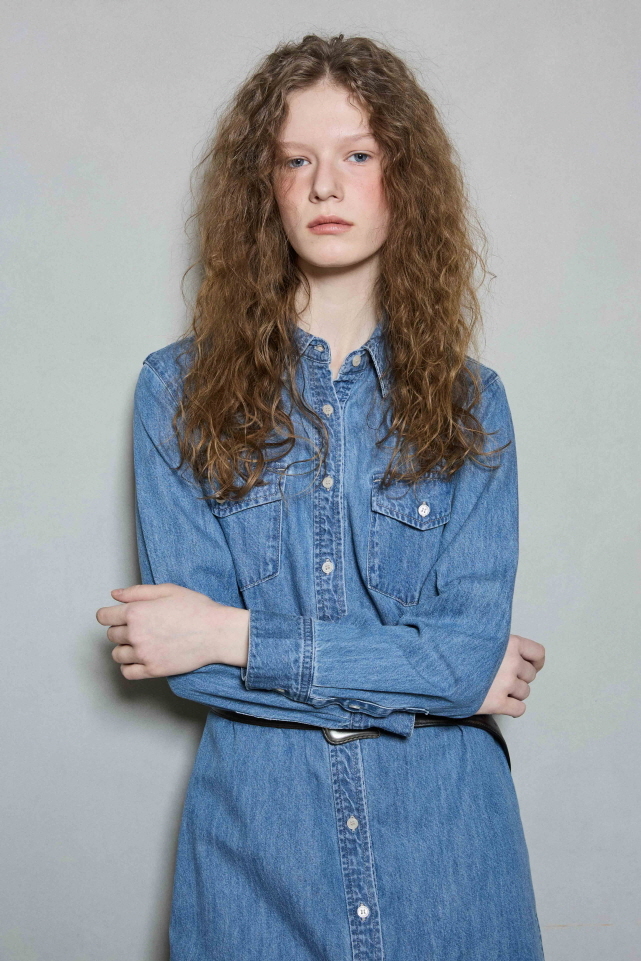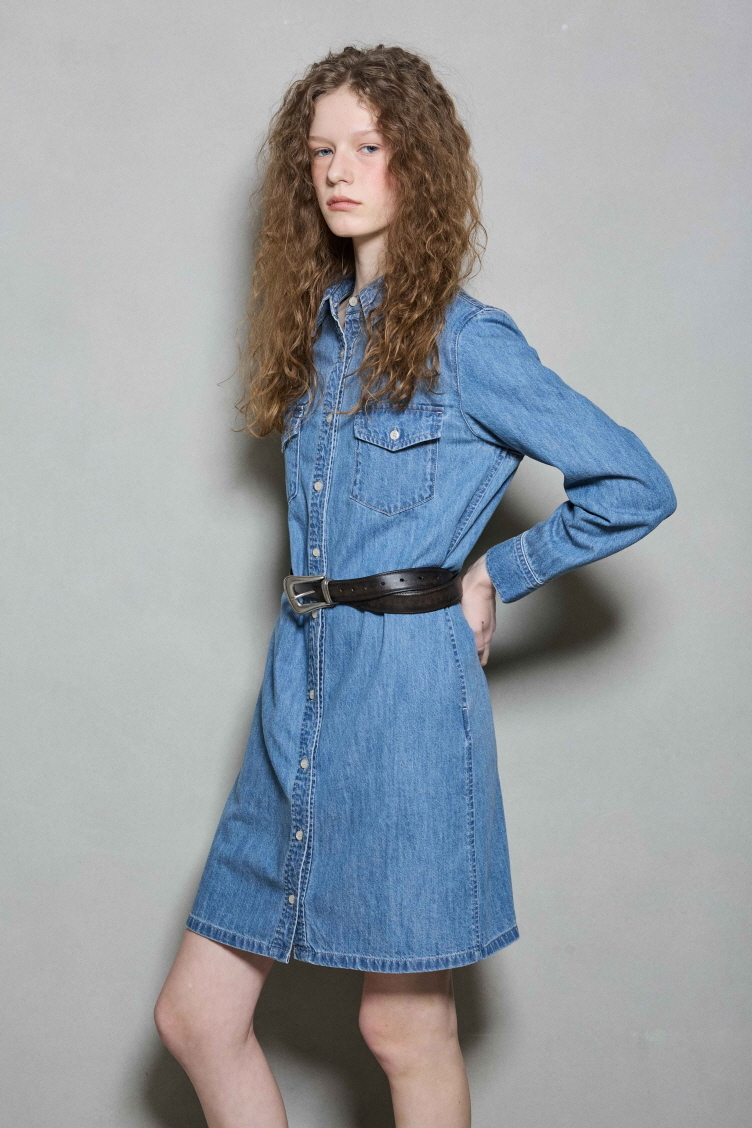 *무릎 살짝 위로 떨어지는 기장감과 여유있는 실루엣의 셔츠형 데님 원피스