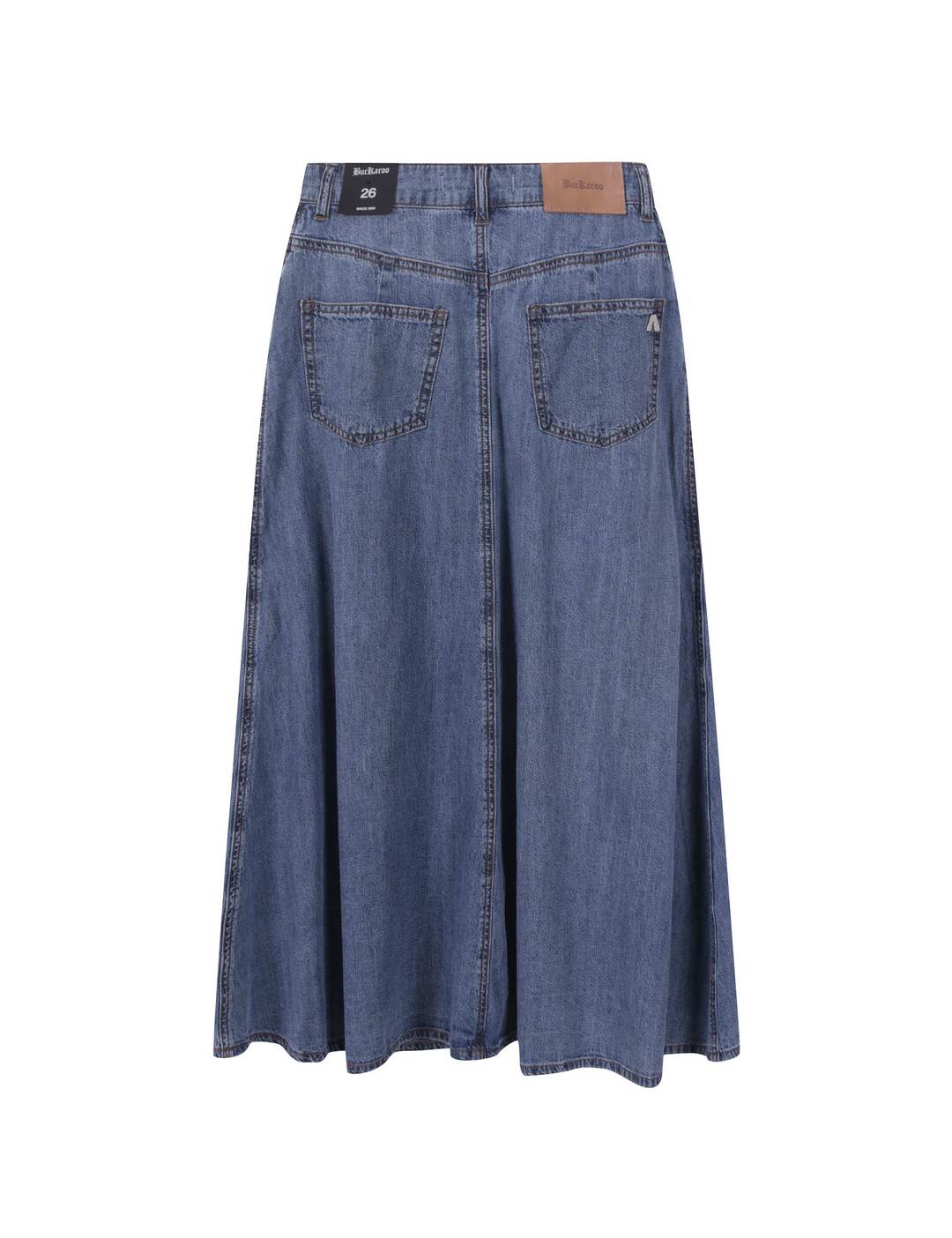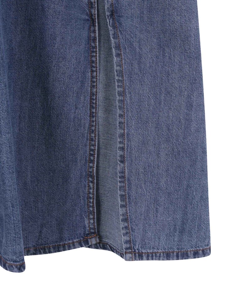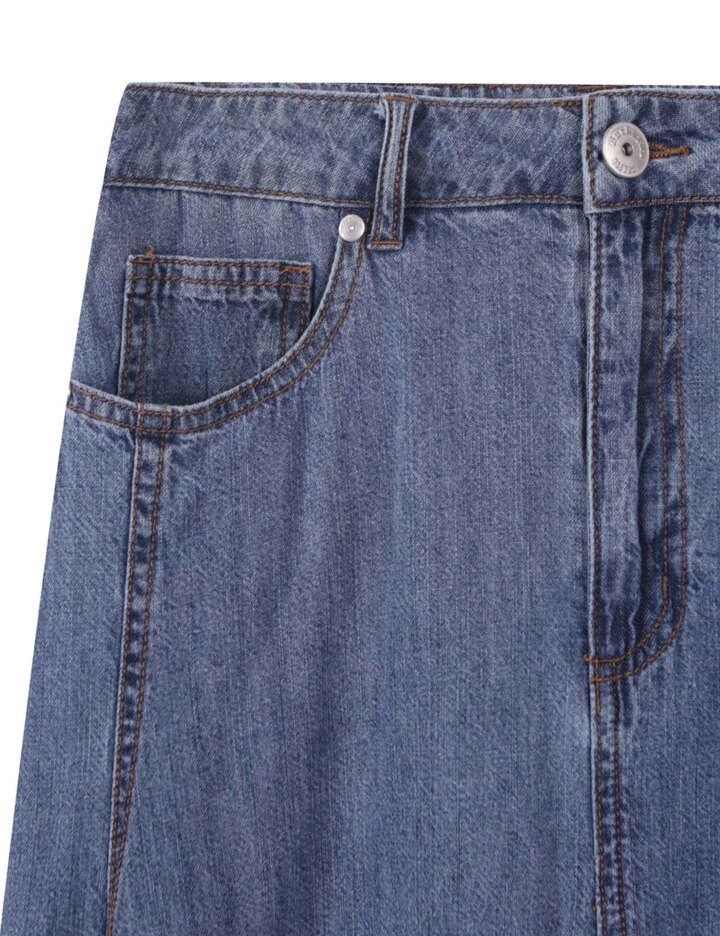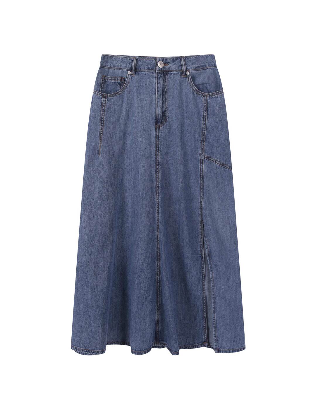 옆선 트임 디테일과 발목까지 내려오는 롱한 기장감으로 우아한 무드를 살린 여성용 플레어 데님 스커트