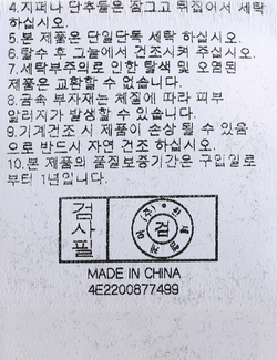 | 세탁방법 및 취급시 주의사항 | 본 제품은 손세탁 하십시오.(케어라벨참고) |