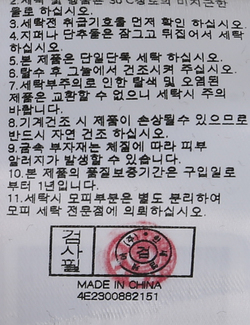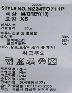| 세탁방법 및 취급시 주의사항 | 중성세제로 단 시간내에 세탁하십시오.(케어라벨참고) |