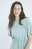 소프트한 터치감의 아스킨 원단을 사용하여 스몰 로고 프린트와 직조 라벨로 포인트를 준 허리조절 가능한 절개 원피스 스타일