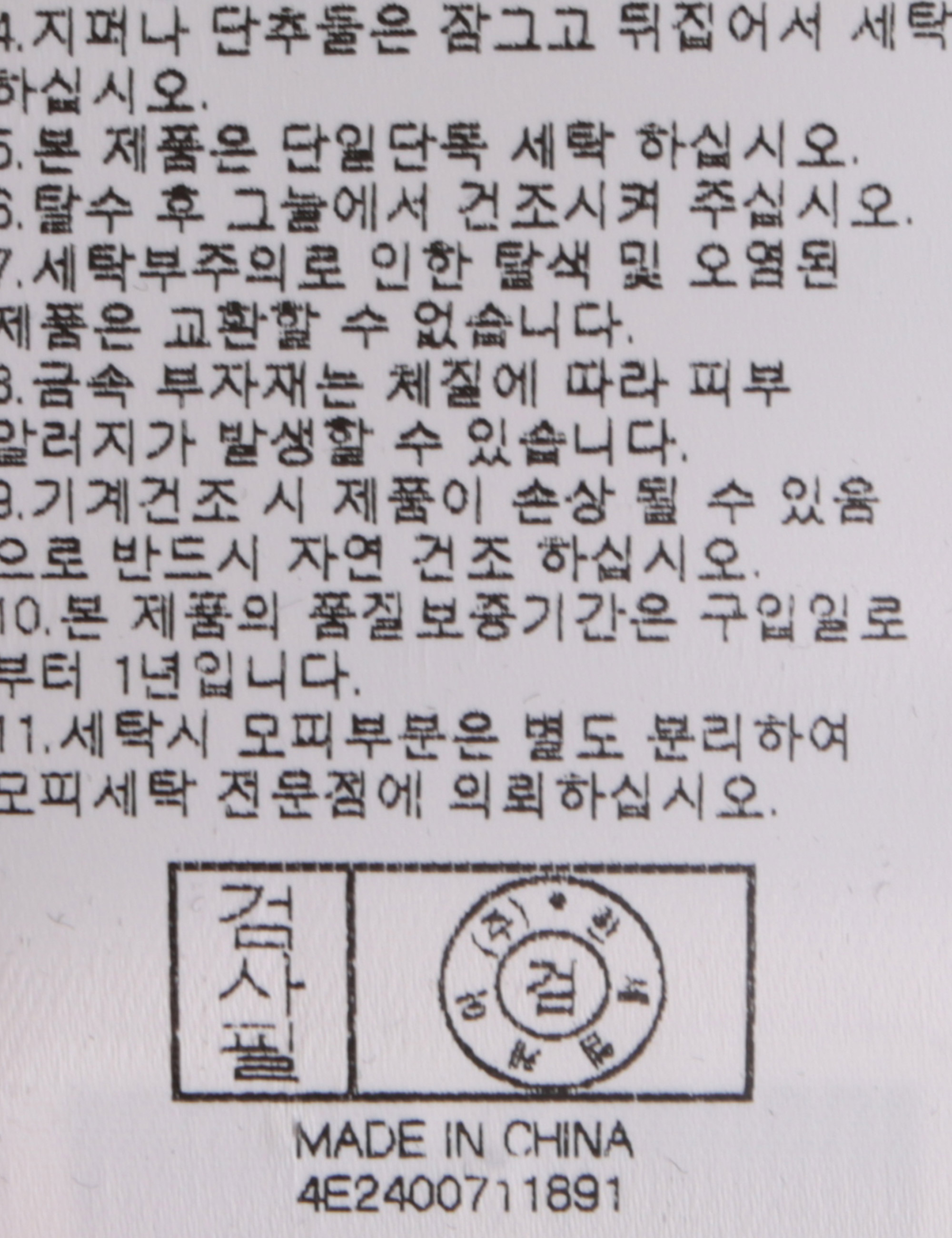 | 세탁방법 및 취급시 주의사항 | 본 제품은 손세탁 하십시오.(케어라벨참고) |