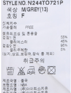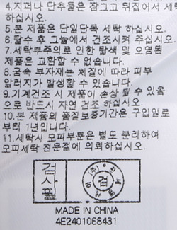 | 세탁방법 및 취급시 주의사항 | 본 제품은 손세탁 하십시오.(케어라벨참고) |