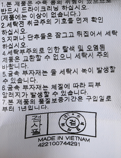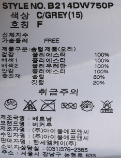 | 세탁방법 및 취급시 주의사항 | 본 제품은 반드시 드라이크리닝 하십시오.(세탁라벨참고) |