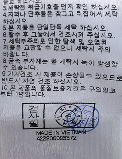 | 세탁방법 및 취급시 주의사항 | 중성세제로 단 시간내에 세탁하십시오.(케어라벨참고) |