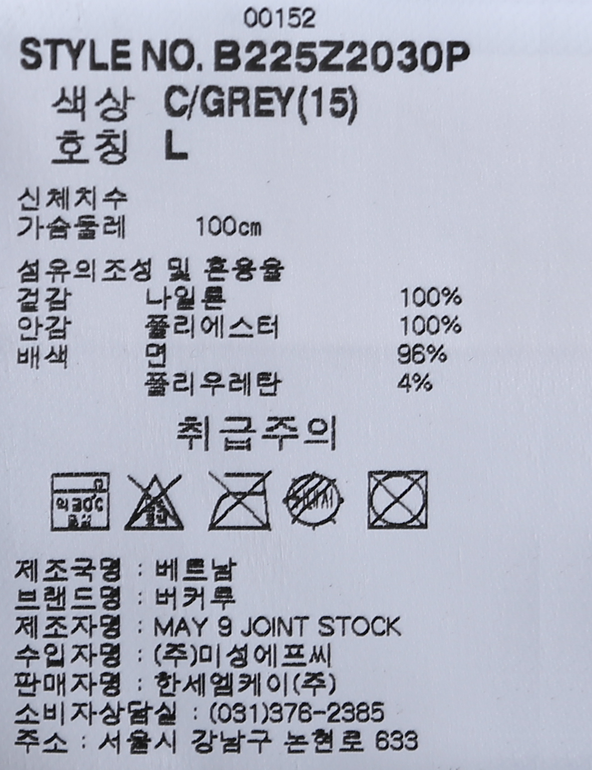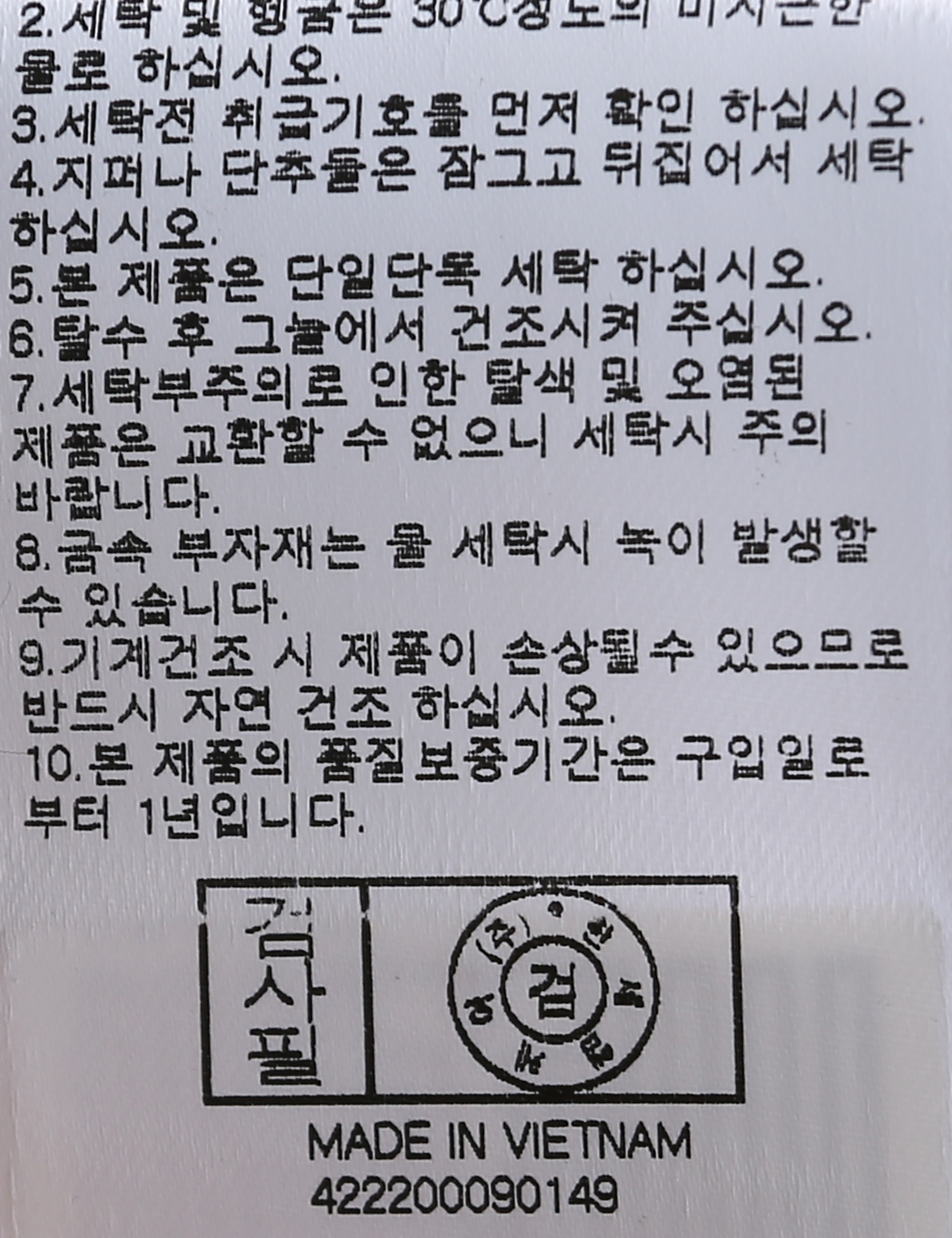 | 세탁방법 및 취급시 주의사항 | 중성세제로 단 시간내에 세탁하십시오.(케어라벨참고) |