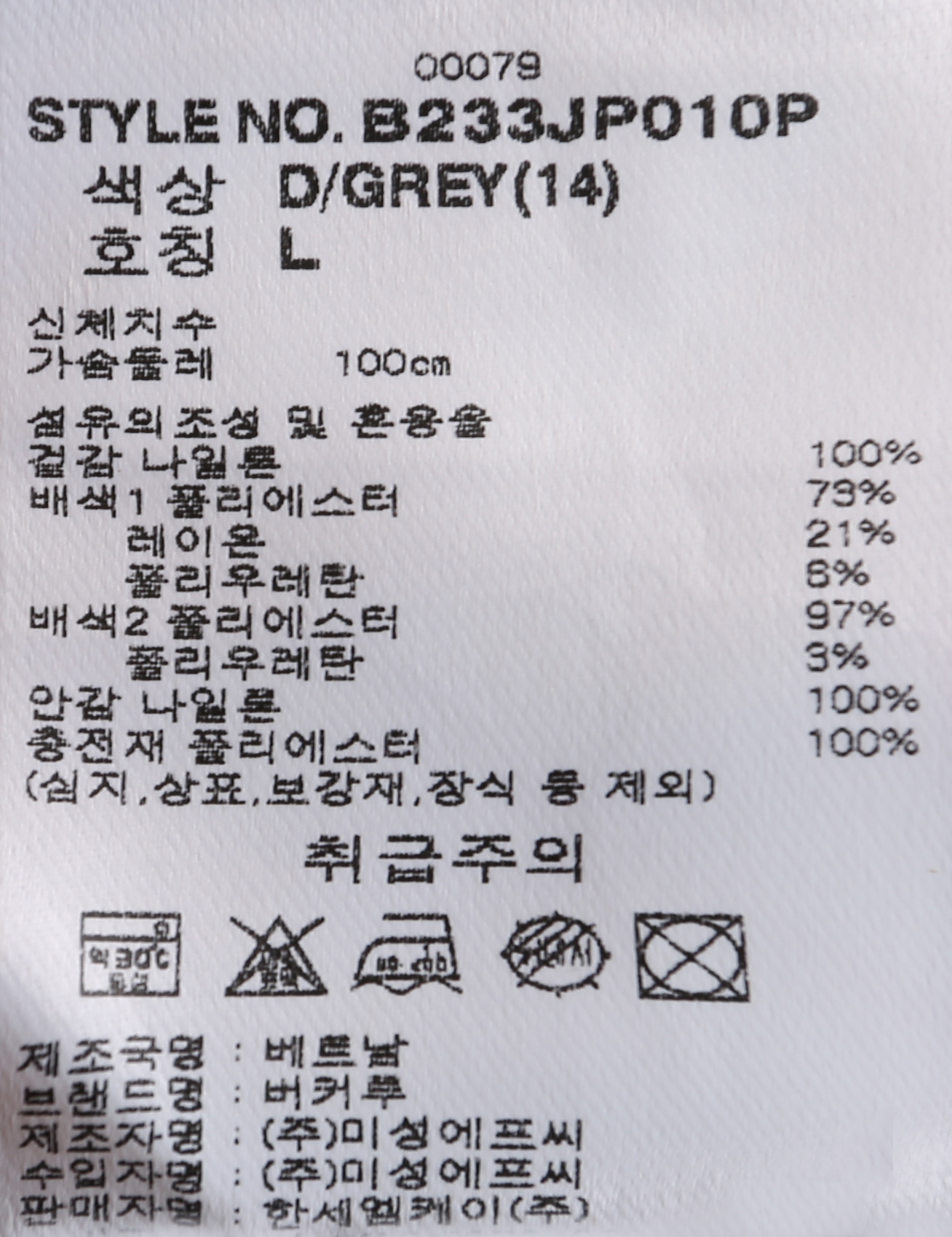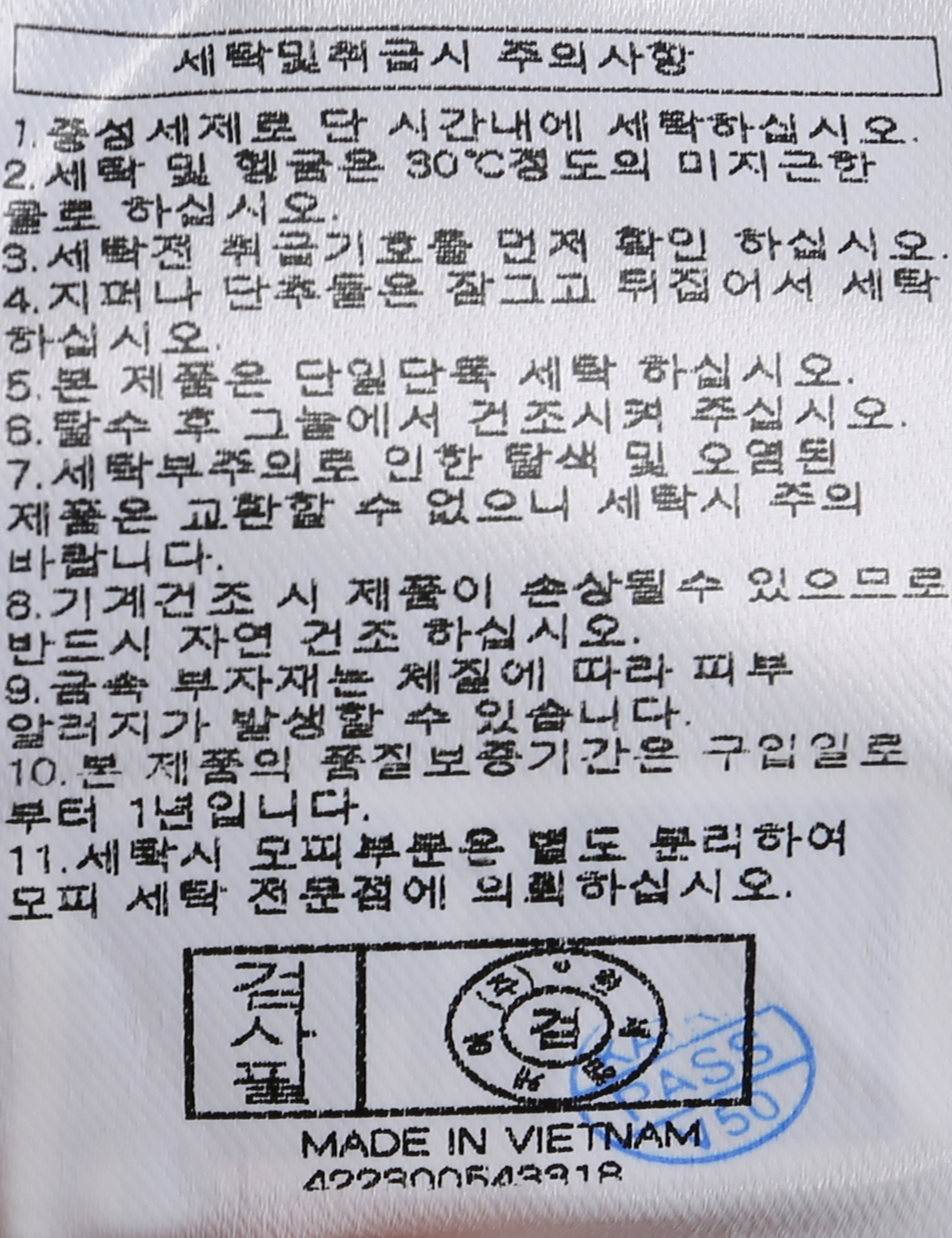 | 세탁방법 및 취급시 주의사항 | 중성세제로 단 시간내에 세탁하십시오.(케어라벨참고) |