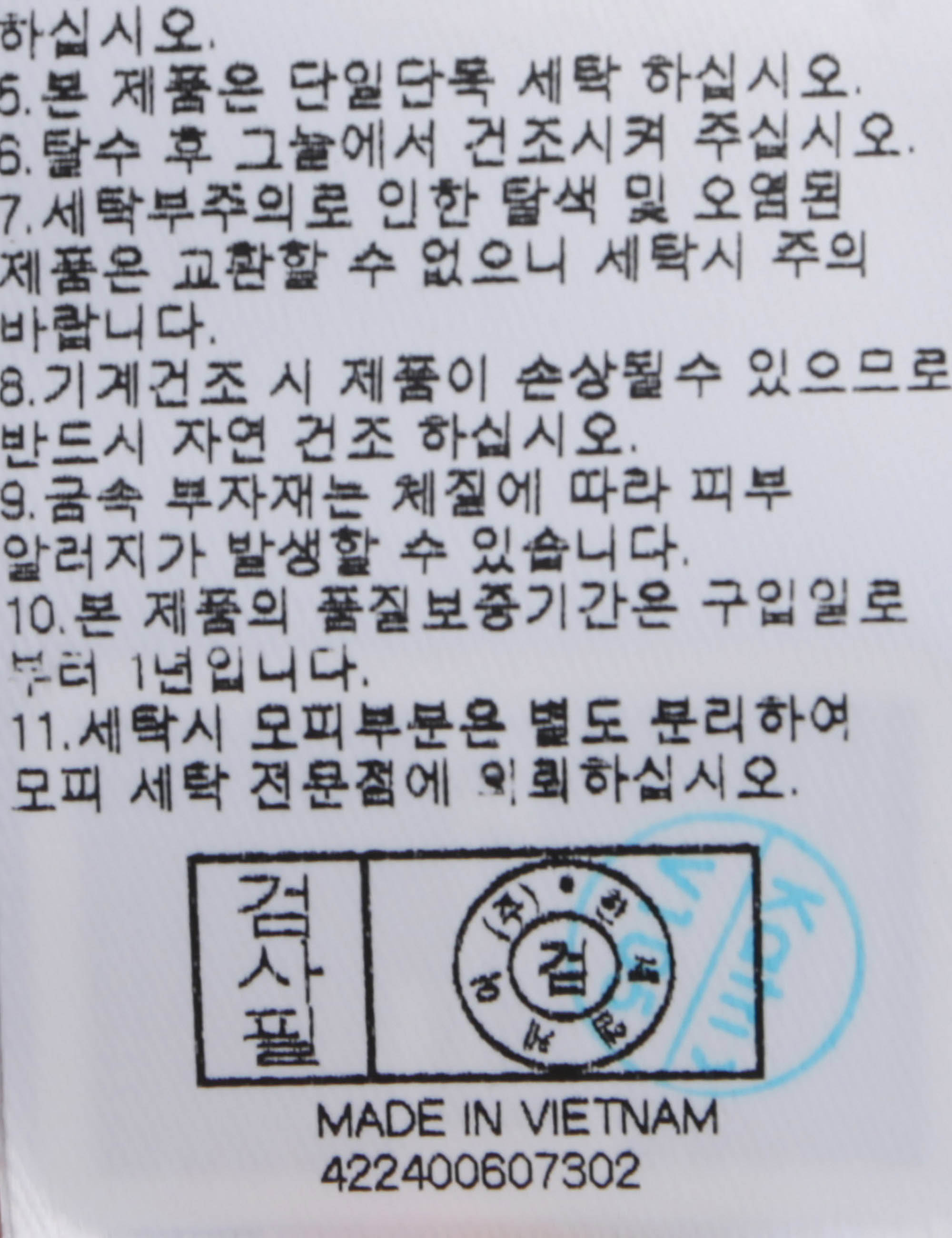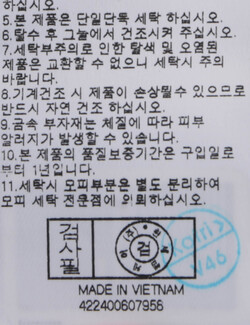 | 세탁방법 및 취급시 주의사항 | 중성세제로 단 시간내에 세탁하십시오.(케어라벨참고) |