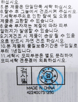 | 세탁방법 및 취급시 주의사항 | 본 제품은 손세탁 하십시오.(케어라벨참고) |