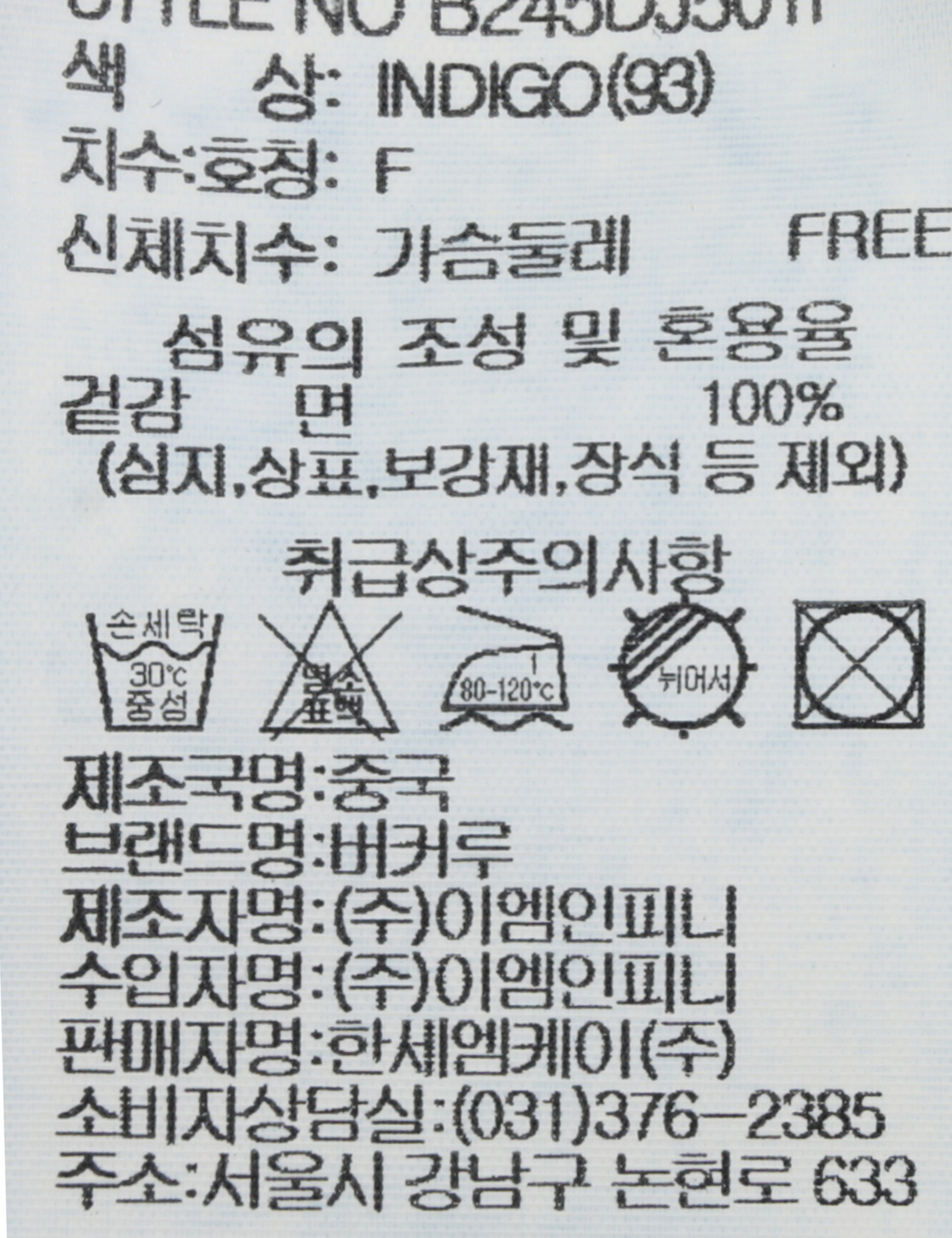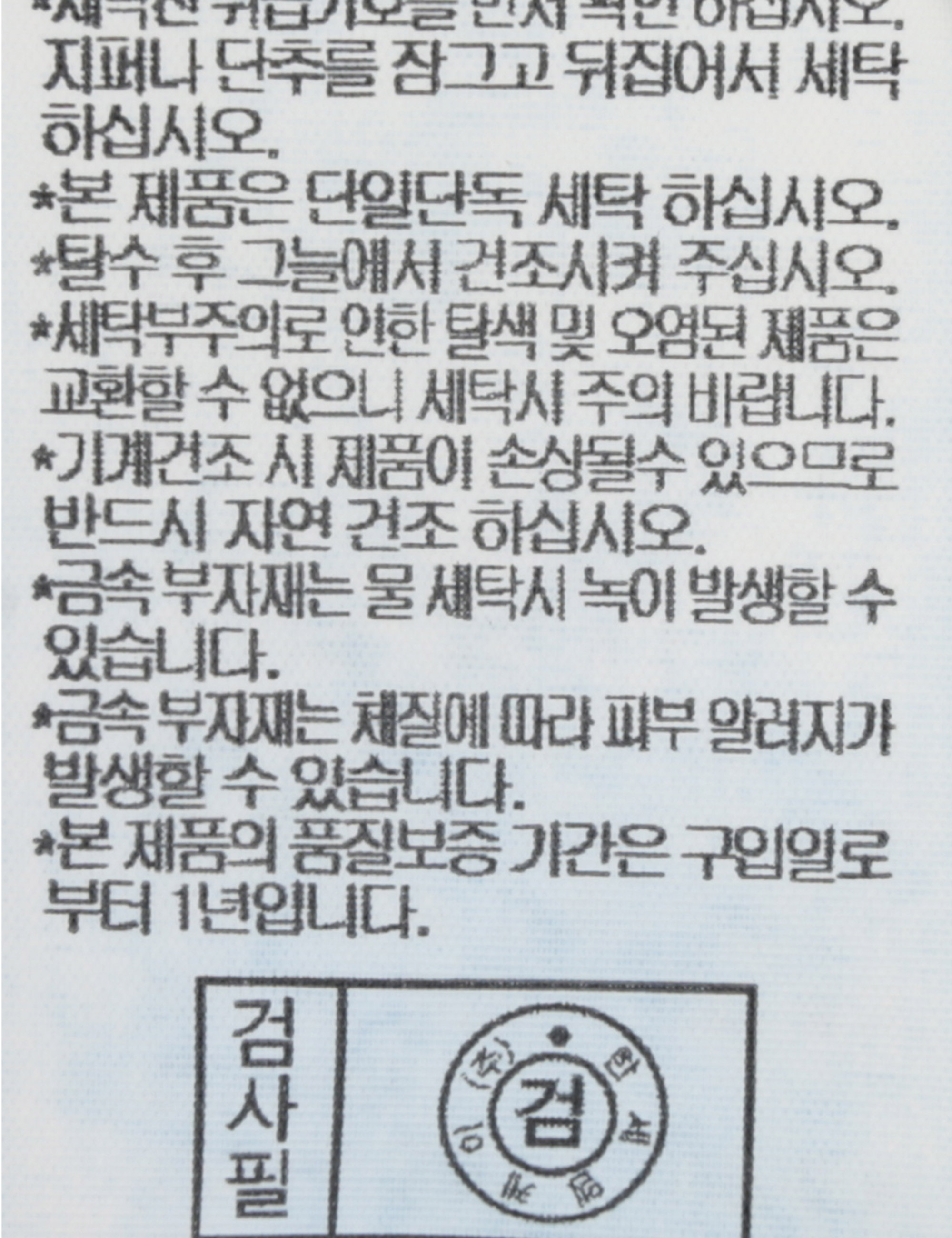 | 세탁방법 및 취급시 주의사항 | 본 제품은 손세탁 하십시오.(케어라벨참고) |
