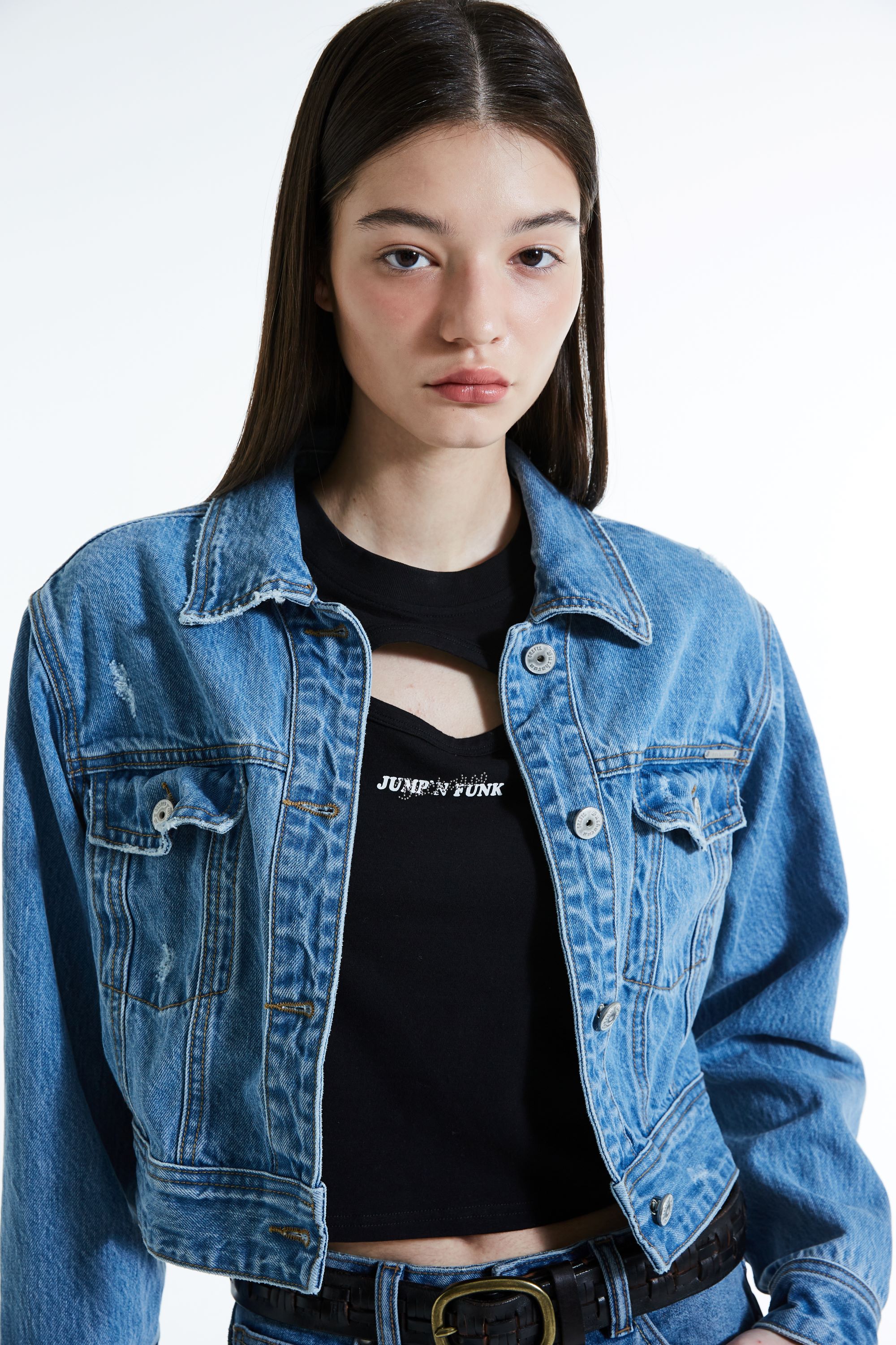 빈티지한 구제 디테일이 돋보이는 데님 트러커 자켓.