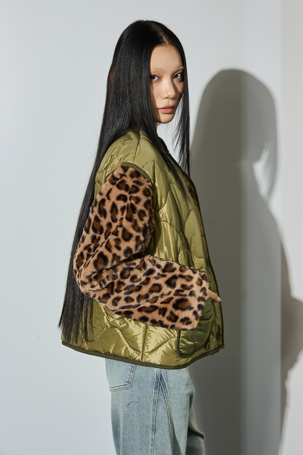 - 소매 레오파드 퍼 배색으로 감각적인 포인트