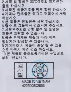 | 세탁방법 및 취급시 주의사항 | 본 제품은 손세탁 하십시오.(케어라벨참고) |